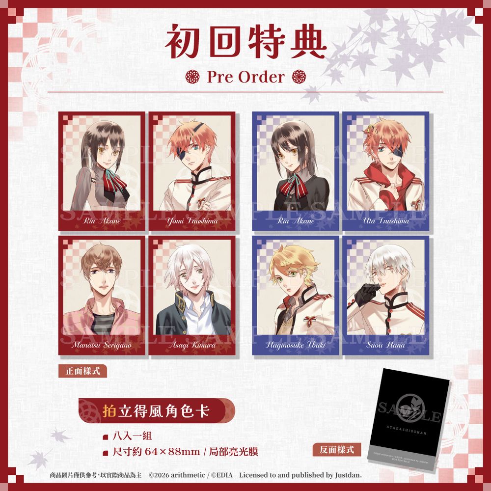 首批实体版将附赠特别设计的八入拍立得风角色卡组。依照「人类篇」和「妖怪篇」的氛围,设计出两组不同风格的精致小卡。