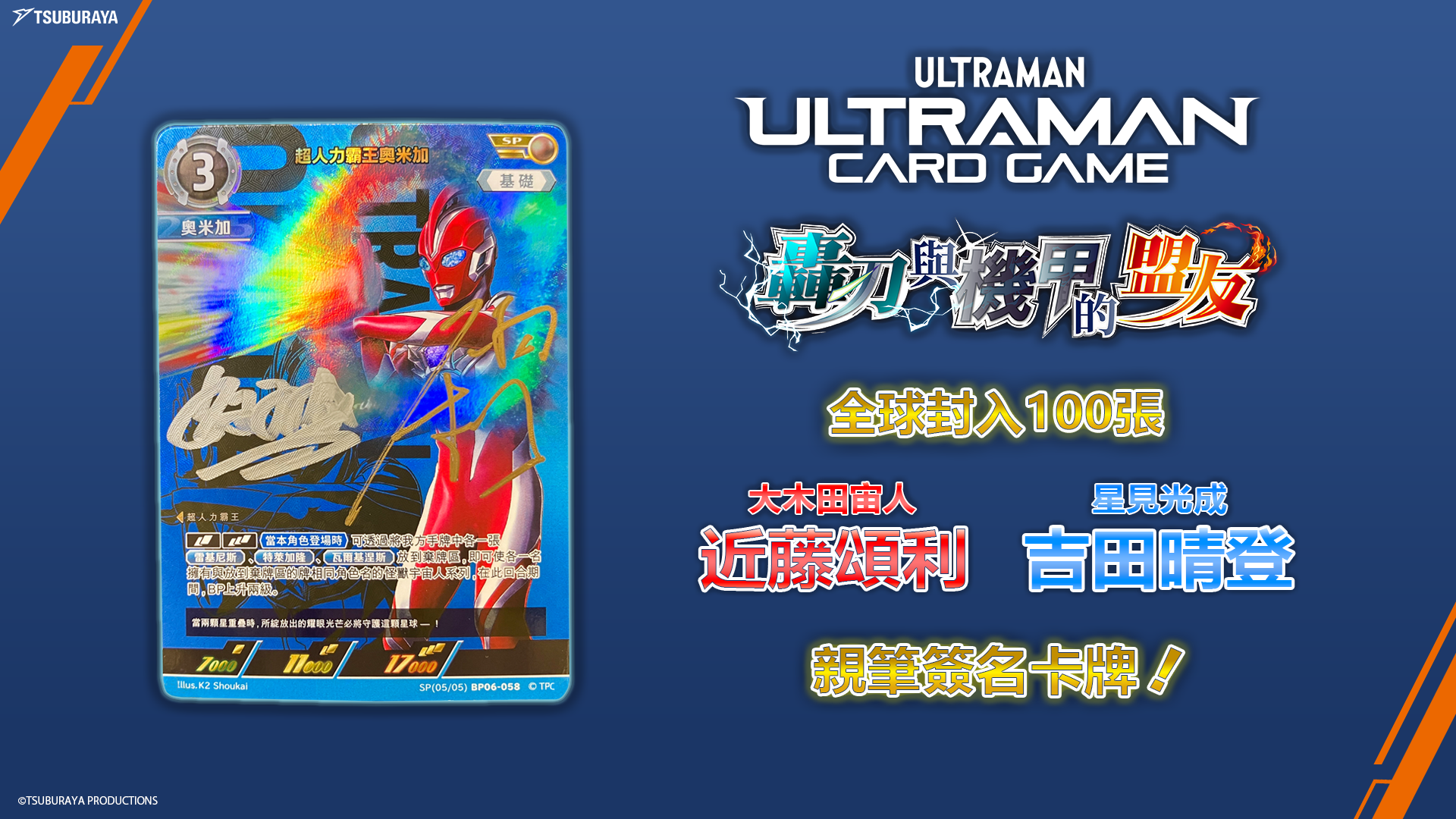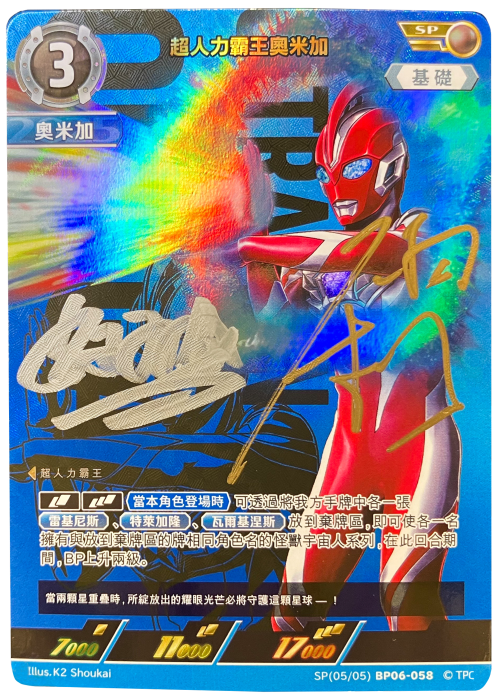 随著《 奥美迦奥特曼 》迎来最终回, 奥特曼卡牌游戏将推出特别限量版 「 奥美迦奥特曼 (SP)」 卡牌,由在《超 奥美迦奥特曼 》中饰演大木田宙人的近藤颂利与饰演星见光成的吉田晴登亲笔签名。