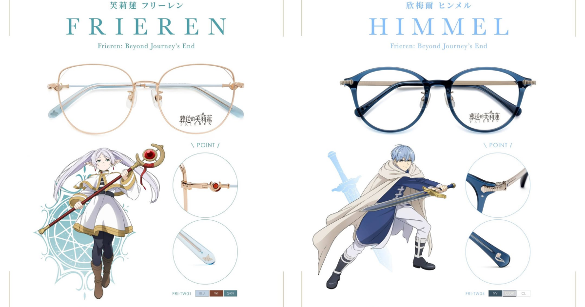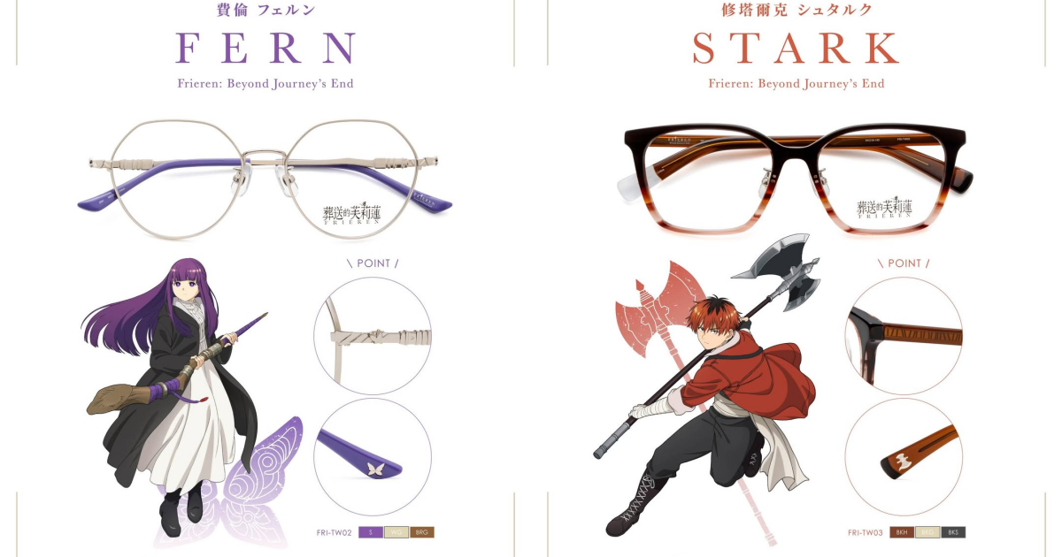 本次系列以芙莉莲、费伦、修塔尔克与勇者欣梅尔为设计主轴,共推出四种镜框轮廓,每款提供三种配色选择,总计12色。从纤细框型到较具分量感的方框设计,能对应不同脸型与穿搭需求,也让动漫角色的气质自然融入日常造型之中。