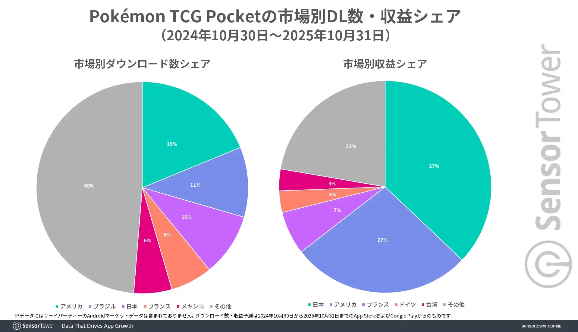 根据 Sensor Tower 数据显示,《Pokemon Trading Card Game Pocket(宝可梦集换式卡牌游戏口袋版)》上市一年的时间里在全球已累积超过 9,000 万次下载,营收也创下超过 12 亿美金的纪录。 Sensor Tower 的数据也反应出,日本是营收最高的市场、维持著高 RPD,游戏在日本也获得了来自各世代玩家的支持。