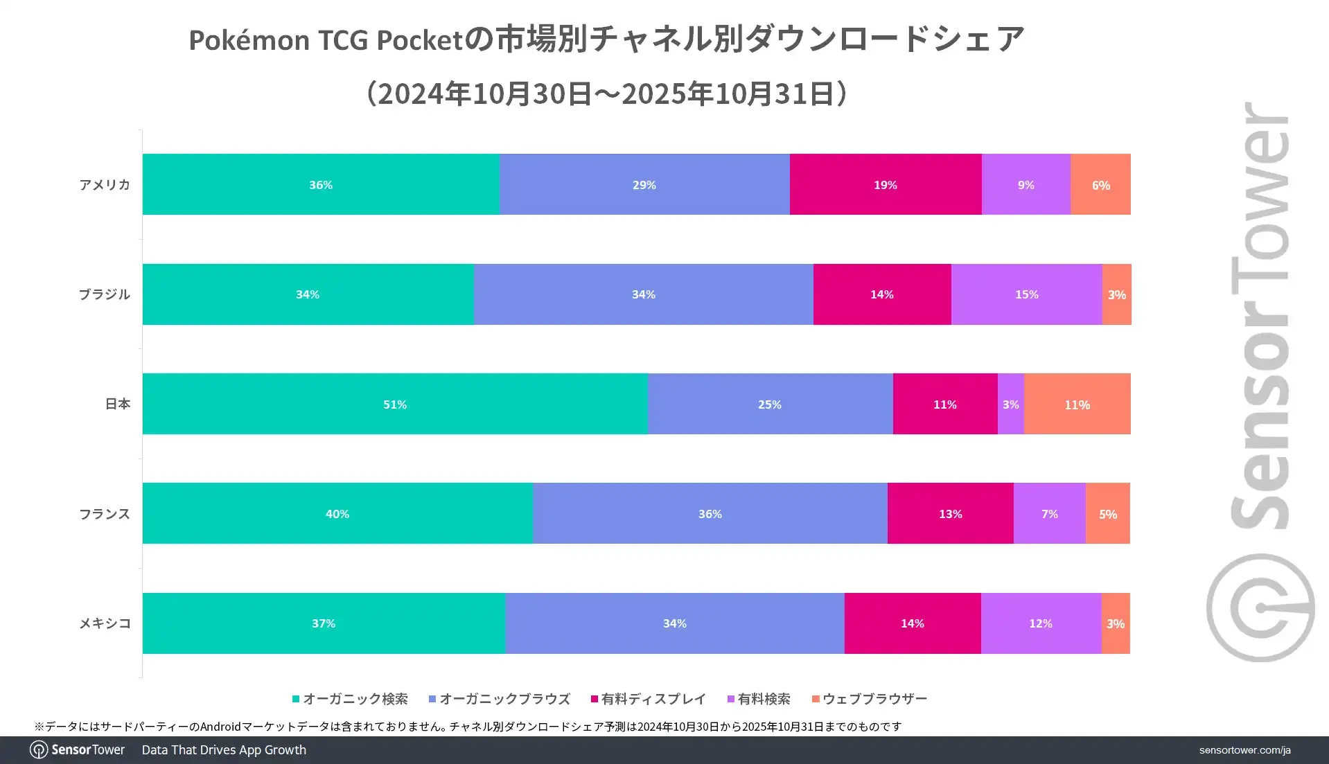 在下载管道方面,日本也与其他市场有很大的区别,从 2024 年 10 月 30 日至 2025 年 10 月 31 日为止,仅有日本市场的自然搜寻占比超过 50% 。Sensor Tower 表示,这代表许多玩家是透过非广告的搜寻结果下载游戏,因此可以推测日本玩家对《Pokemon Trading Card Game Pocket》拥有极高的热忱。