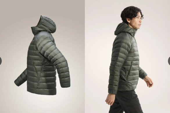 技术解析:Down Composite Mapping(复合羽绒结构)核心保暖区域使用填充 850 FP 欧洲白鹅绒,确保即便在湿冷环境下,依然能维持卓越的锁温性能。天然羽绒怕湿的特性,因此在容易产生汗气、湿气的部位(如腋下、袖口)配置 Coreloft 化纤保暖材质。