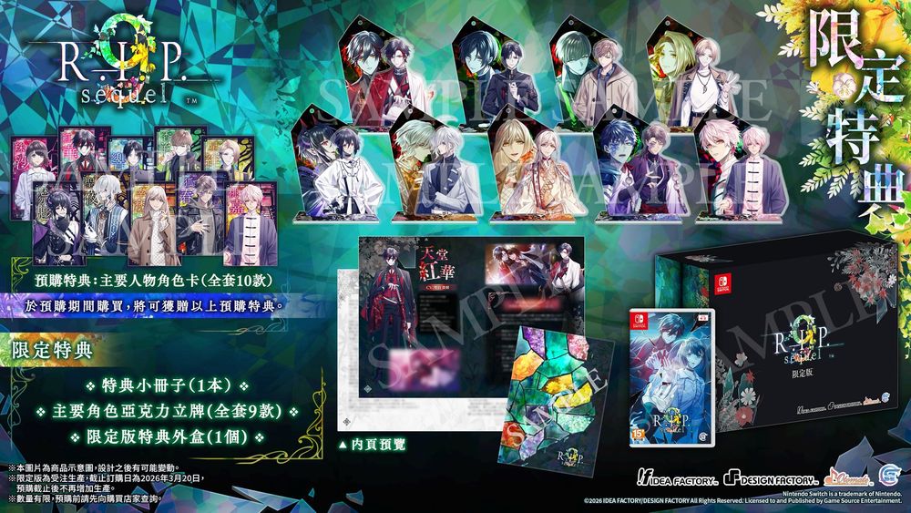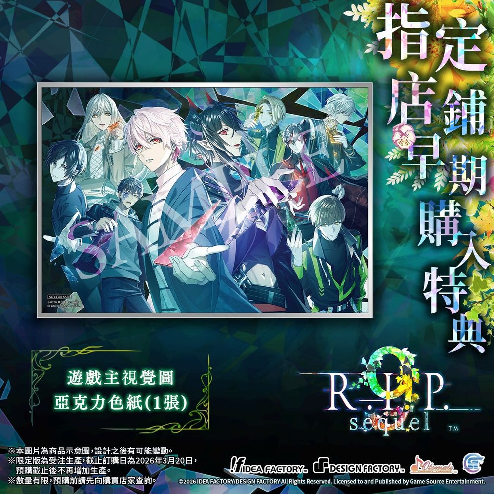 Game Source Entertainment(GSE)宣布,灵异题材乙女游戏《9 R.I.P.》的续作《9 R.I.P. sequel》将推出繁体中文版,并预定于 2026 年 5 月 14 日在 Nintendo Switch 平台上架。本作将承接前作两种结局「终幕・天」与「终幕・神」的剧情,另外收录了番外篇「成海之滨九大不可思议」,再度与鬼怪们展开一段奇妙而诡异的恋爱故事。官方也抢先公开了《9 R.I.P. sequel》的预购特典、限定版内容,以及指定店铺的早期购入特典资讯。