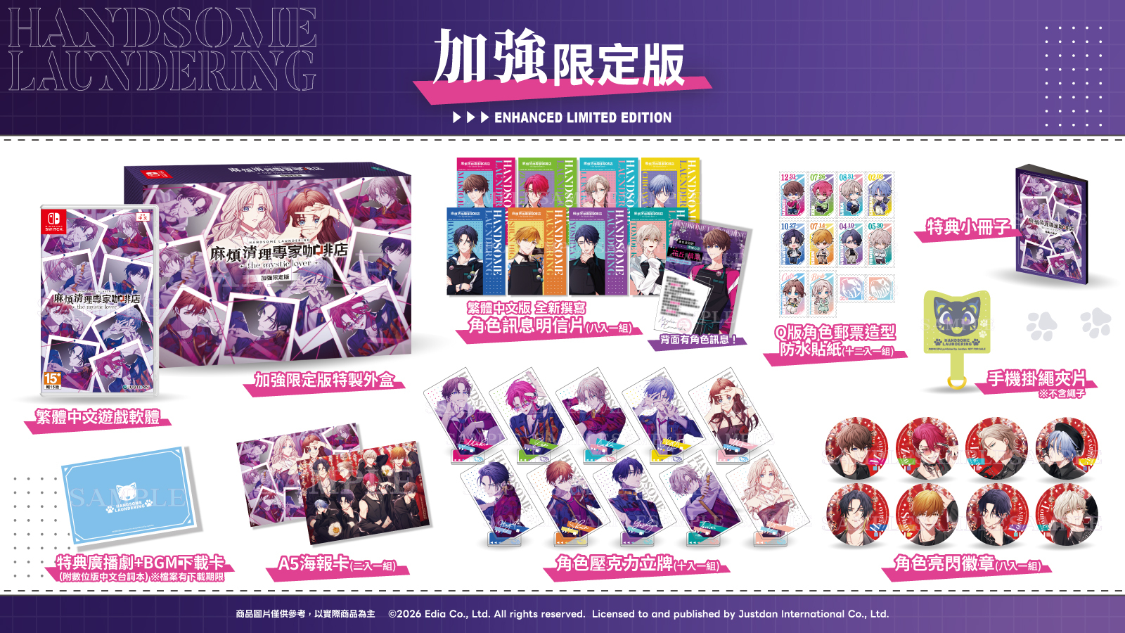 加强限定版包含特制外盒、完整中文化特典小册子、特典广播剧 + BGM 下载卡、A5 海报卡、繁体中文版角色讯息明信片(全新撰写)、Q 版角色邮票造型防水贴纸、手机挂绳夹片,以及角色立牌和亮闪徽章等丰富内容,等着各位玩家来一探究竟。准备好与各具魅力的「L & L café space」店员们,一起进行神秘委托了吗?