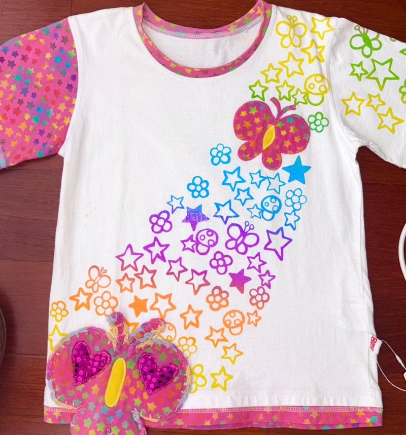 这次淘到一件超漂亮的立体蝴蝶短袖。这个短袖的牌子以不同材料的remake再造出名。这件到手以后真的超惊喜!两边袖子都是不一样的星星图案,立体的小蝴蝶非常生动可爱,衣服整体穿着很舒适!成色很棒!非常喜欢挖煤的原因也是因为系统对成色的标注很准确很显眼,物流非常迅速!下次继续!