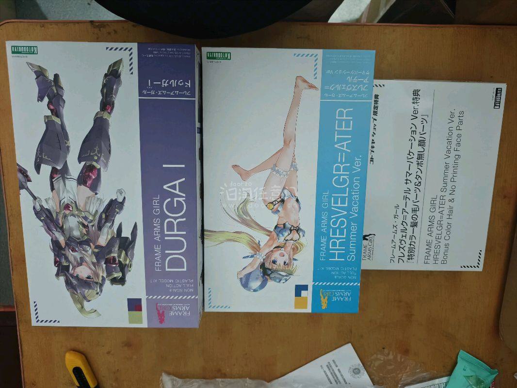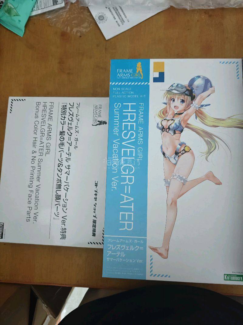 这次呢,又从挖煤姬在日拍上买了寿屋的泳装白大鹫带特典的和杜尔迦带特典,这两盒都是好价入手,国内特典的存货不多了,普遍价格偏高。这次箱子的也是加了填充物,中通快递也是很给力,箱子依旧八角尖尖,竹蜻蜓速度也很快。挖煤姬当属海淘的好去处。