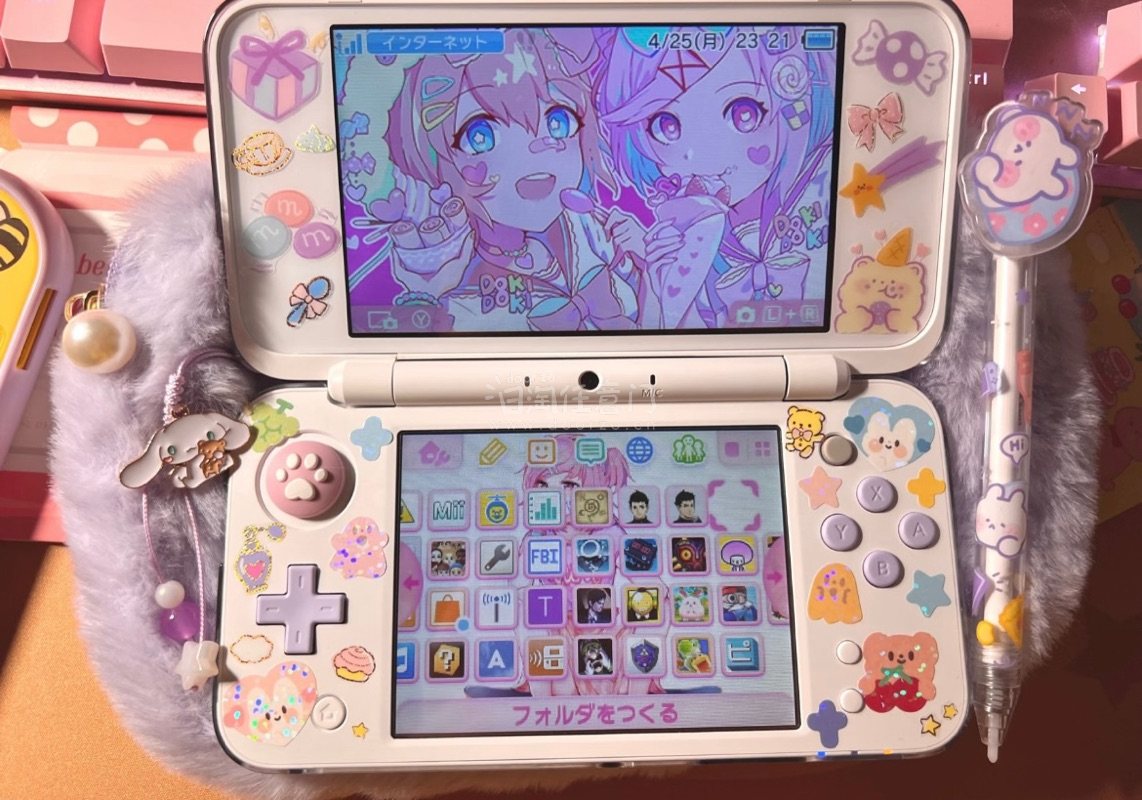 其实可能还是本色光版比较好看 毕竟新大二这个紫白配色本身就很好看呜呜呜 贴纸有点闪用起来变得晃眼睛了,买了个紫色的毛绒化妆包用来当游戏机包包 猫爪摇杆帽是switch用旧了的做成了n2dsll用的 其实3ds2ds系列的摇杆帽都可以这么改 触控笔是在线下随便一个杂货店买了回来自制的