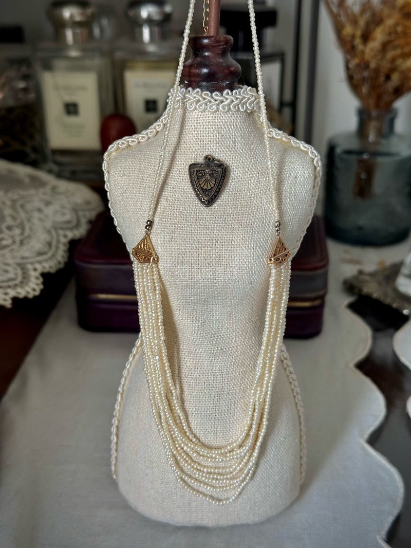 奇妙的设计,很华丽的叠戴,但是居然是短项链,有点不知道怎么搭配了。 镀金的收尾球变黑了,有点显眼,考虑去替换为k金的。