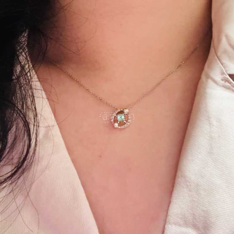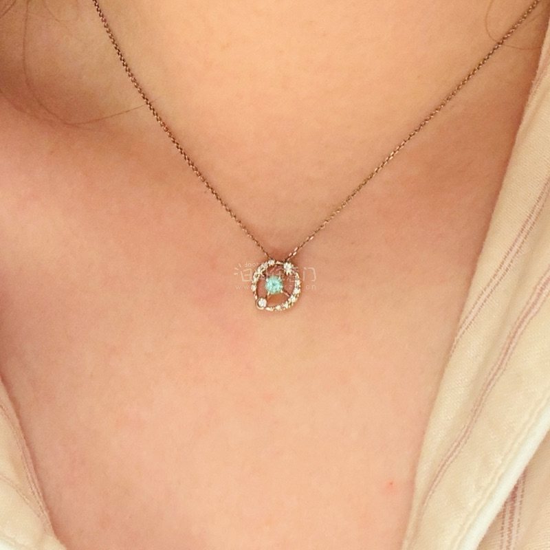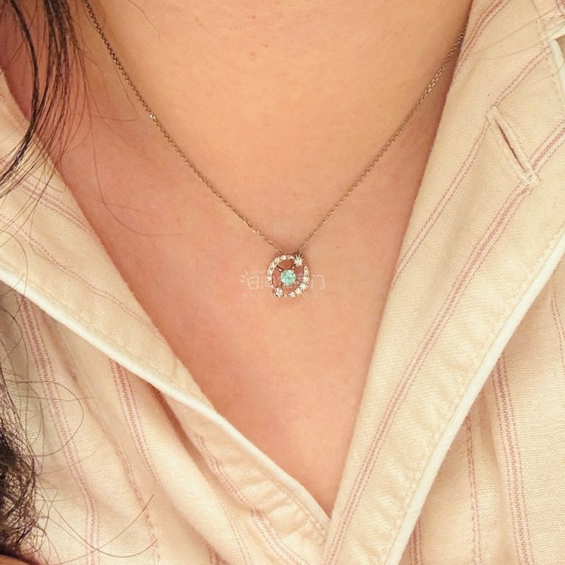这次在挖煤姬上购买的项链特别满意,材质是Pt950铂金+帕拉伊巴碧玺+钻石,其中两颗钻石镶嵌做了太阳和月亮的形状,中间的碧玺代表了地球,外层的圈是星轨。很喜欢这个设计。