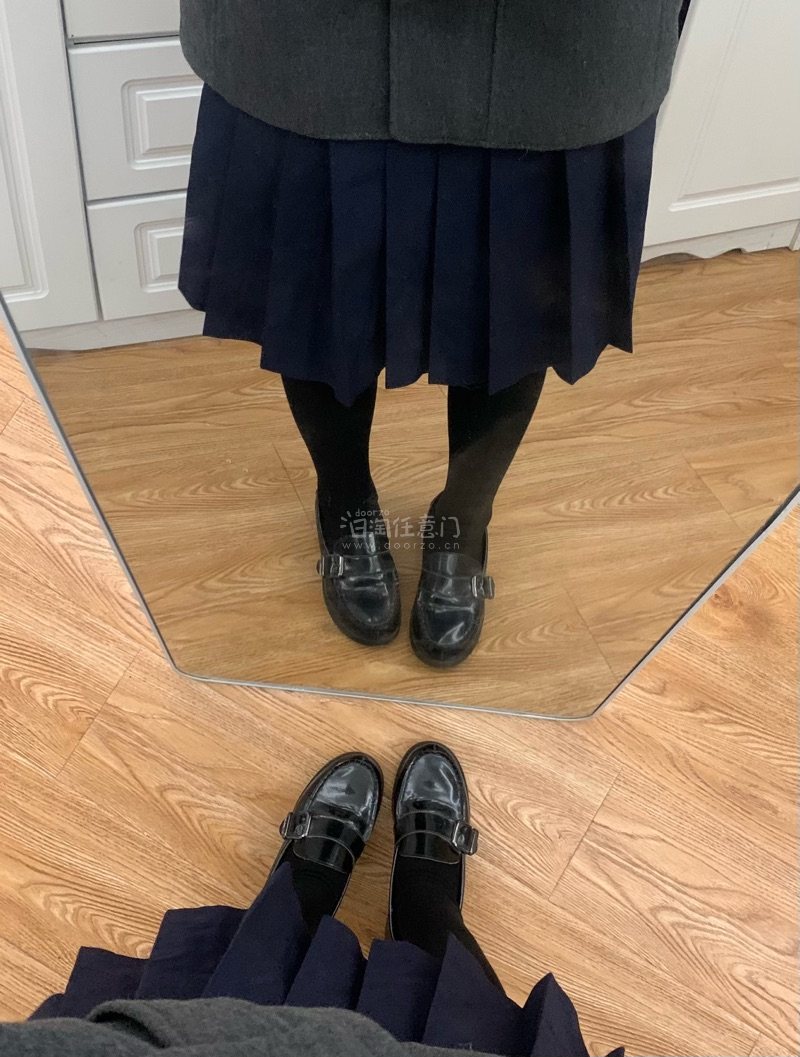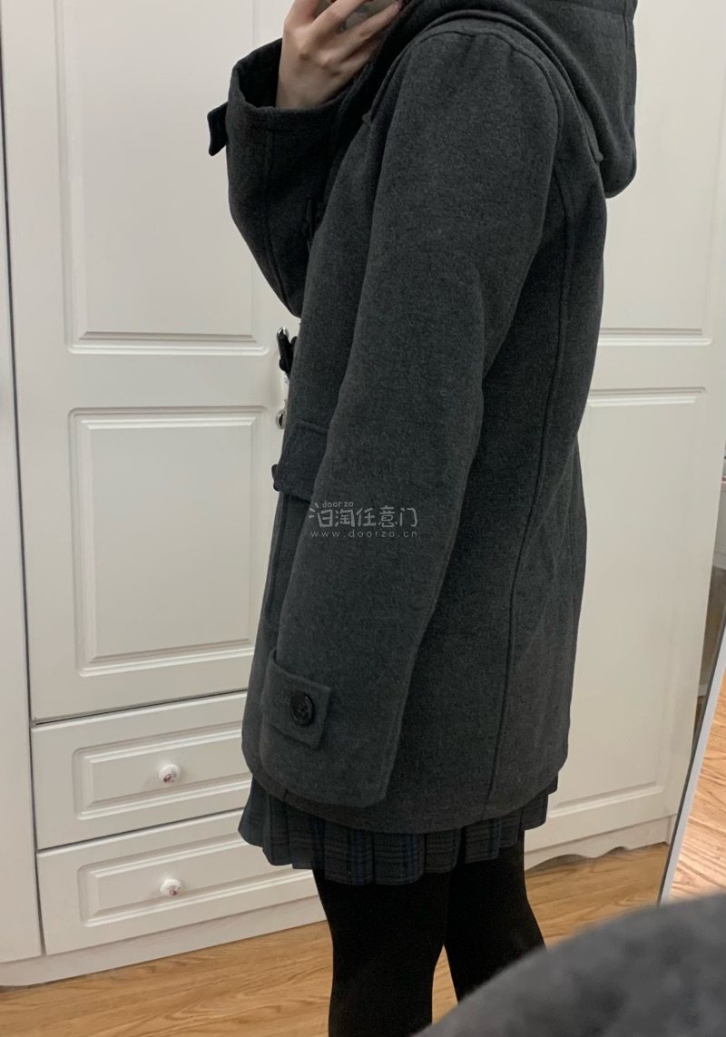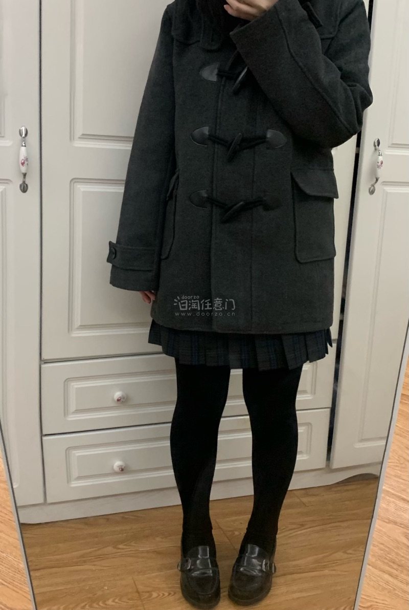 颜色是带一点灰调的深灰色,非常沉稳耐看,完全没有偏蓝或发黄的问题,搭配任何颜色的格裙都不会违和。版型是微微A字的宽松设计,对身材包容度很高,里面叠穿衬衫、毛衣甚至西装外套都完全没问题。 牛角扣和木扣的质感很棒,细节做工很扎实,口袋又大又深,冬天可以暖手也能装东西。面料厚实但不会太重,保暖性在南方初冬足够了,北方深秋穿也合适。 最让我惊喜的是它的“校供感”——不是那种软塌塌的时尚款,而是真正有 JK 制服魂的扎实大衣!搭配本校绀裙或浓绀裙很有优等生气质,搭配浅色格裙又很清新,配制服包一整套下来特别有氛围感