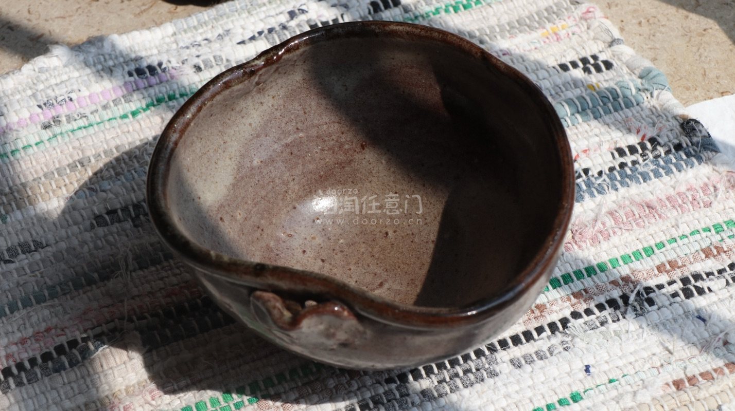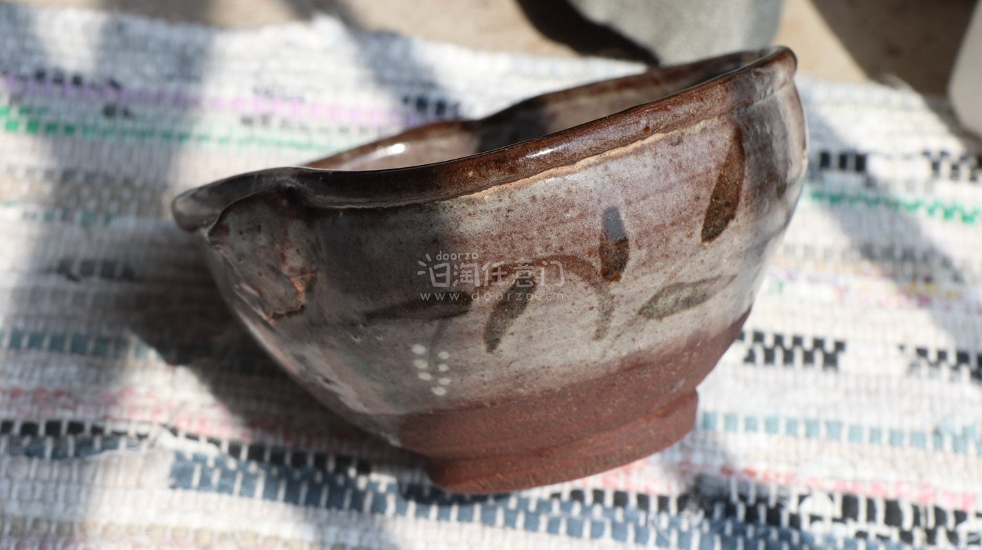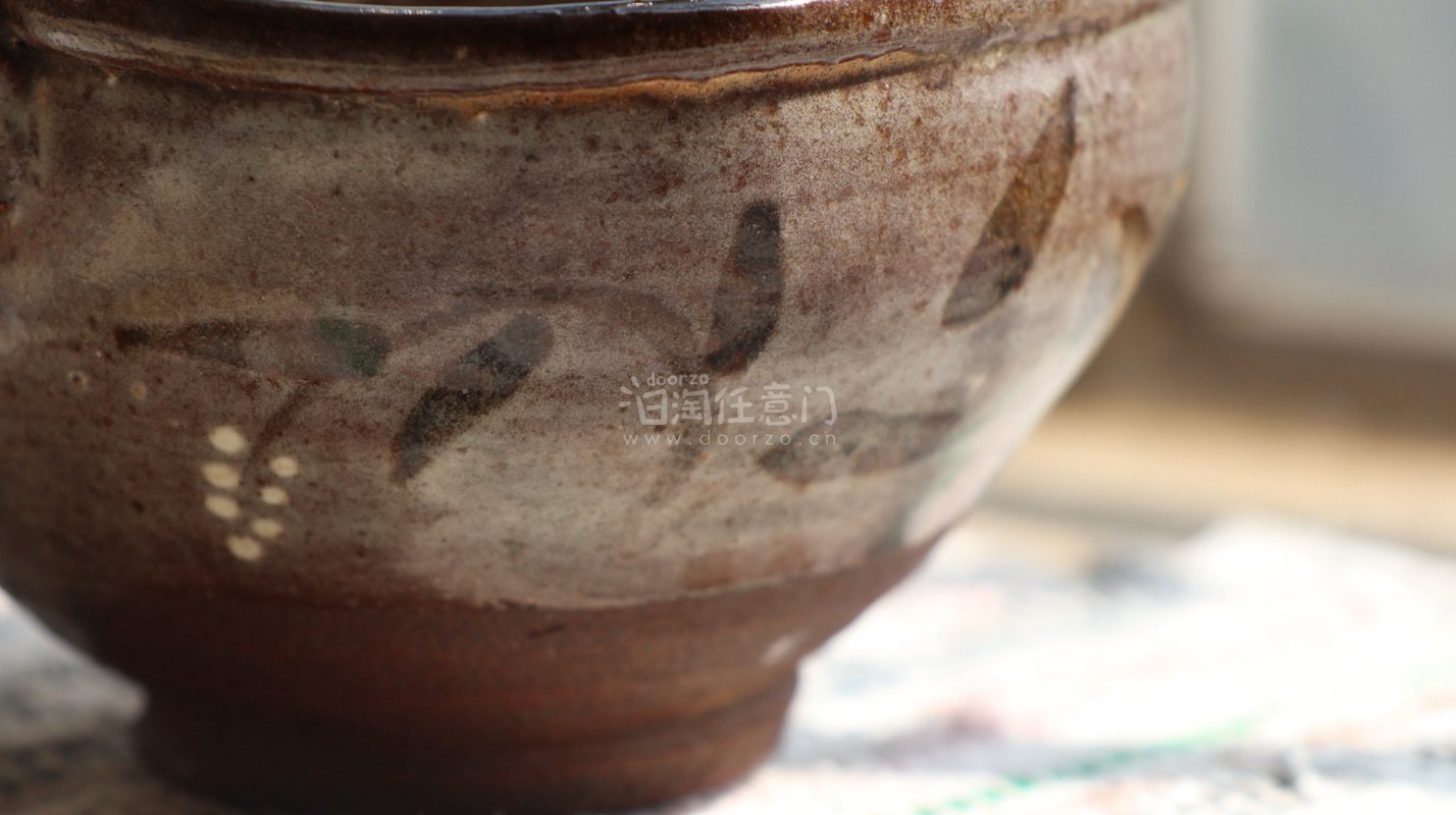 非常漂亮的唐津抹茶碗,手工拉胚很有生活气息,碗身上手绘的芦花图案非常质朴,同时鼠灰色的釉面搭配绿色的抹茶相得益彰。