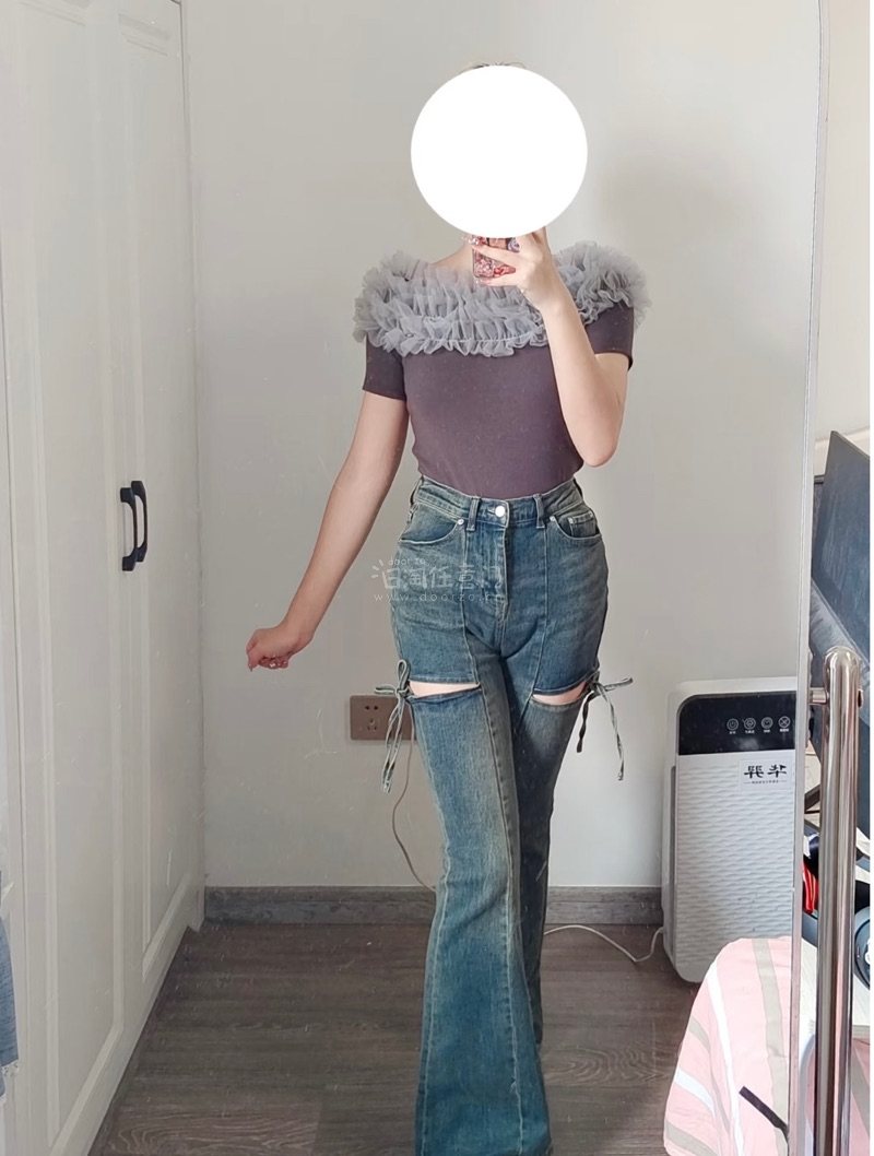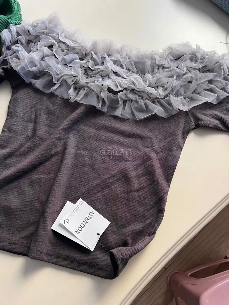 这件上衣以深灰为底,领口与肩部缀满蓬松的浅灰薄纱褶皱,一字肩设计露出肩颈线条,甜酷交织,灵动又不失个性。穿上也太好看了