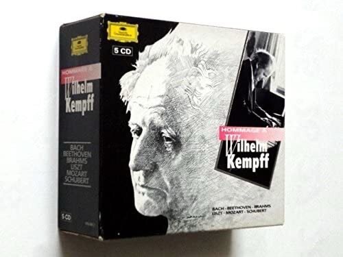 向威廉.肯普夫大师致敬!法国DG公司出了这套5cd, 封面有获得的法国金唱片和音乐协会大奖logo, 和宝利金中古碟红色logo,一代钢琴大师肯普夫弹奏的巴赫,贝多芬,勃拉姆斯,李斯特,莫扎特,舒伯特作品浓缩在这套5张的特典纪念套装里。