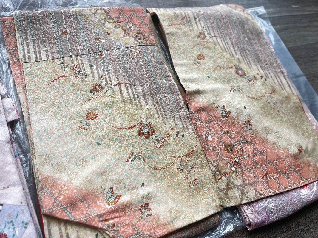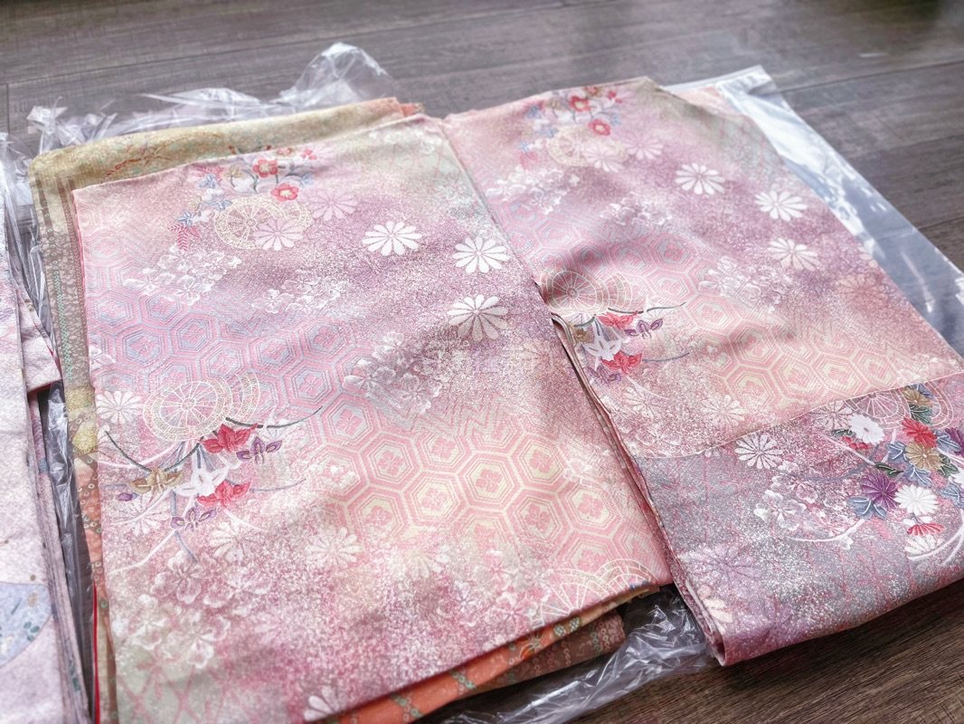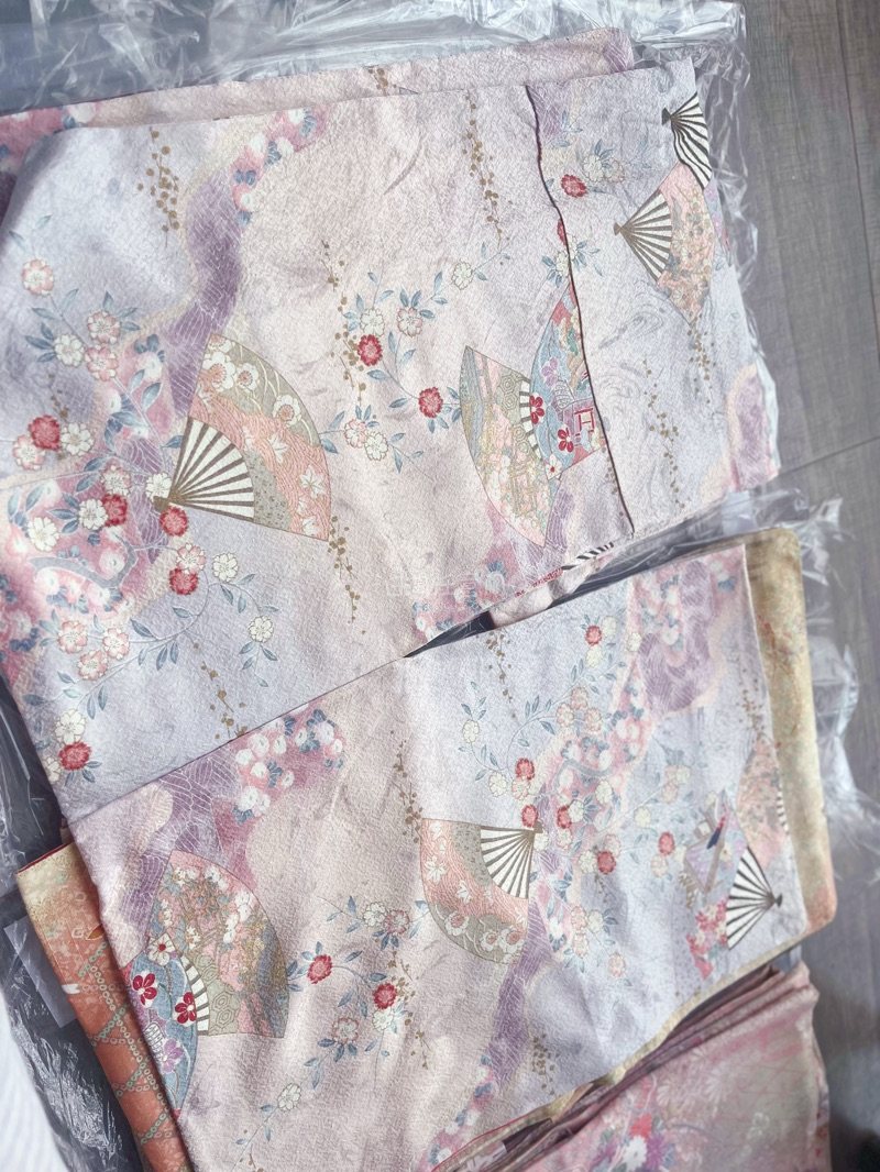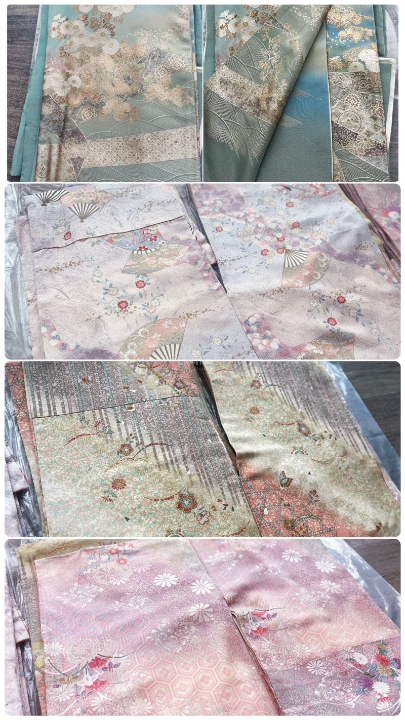 海运等活我了 嘎嘎美丽,可惜现在是阴天,有阳光的时候再补个视频效果。 绿色先自留,别的这周拆开挑下瑕疵后出,拆之后找尖尖烧一下防止不是真丝的情况。 碎碎念: 绿色色差还可以,晚点再展开,描金很精细,渐变也和预览一样很好看。 扇子(左2)的实际颜色很漂亮,很清新的蓝粉,(商家拍的高糊黄白),手感比较糯。 竖条纹(右2)的手感不是很软糯,应该是有点硬和麻的那种。 粉花(右1)正常发挥,和预览图没什么偏差。手感平滑。