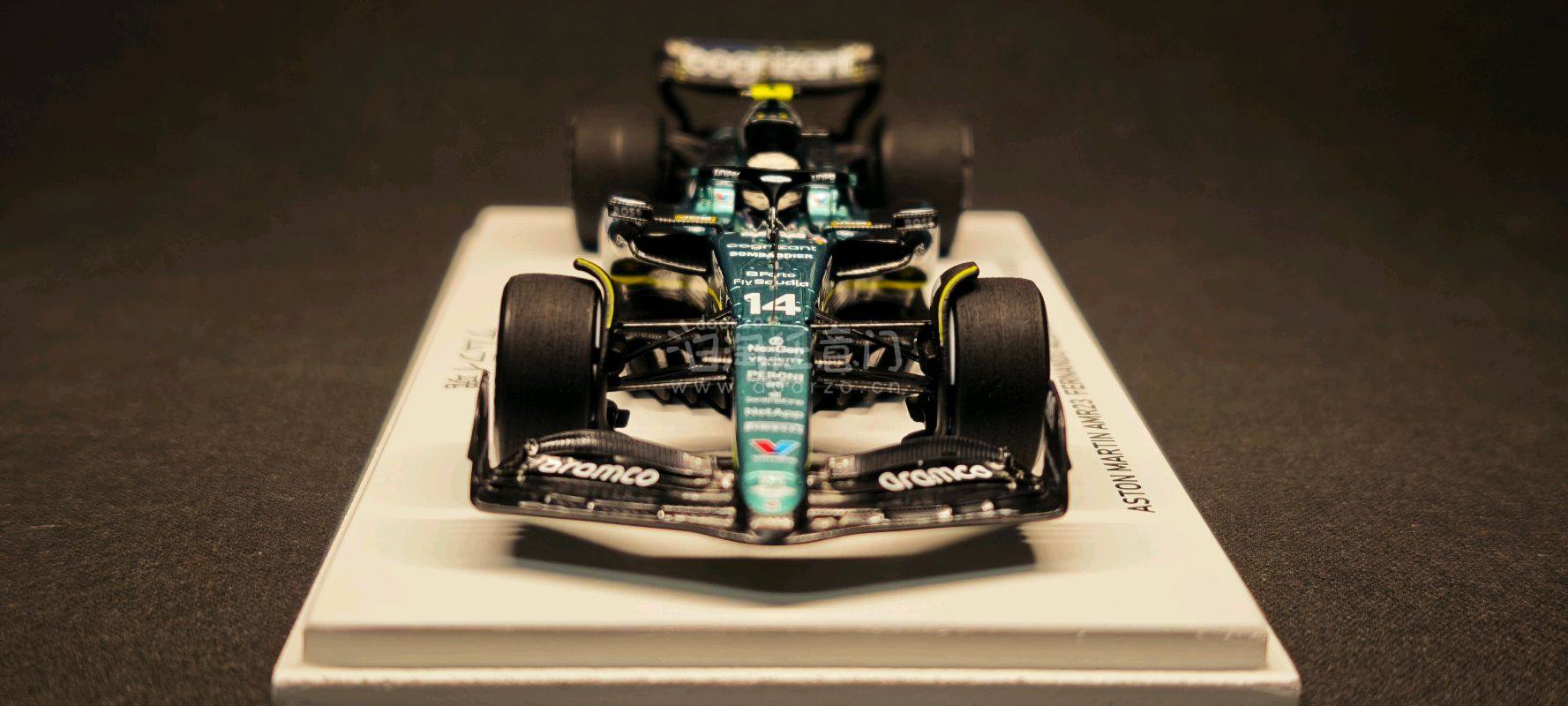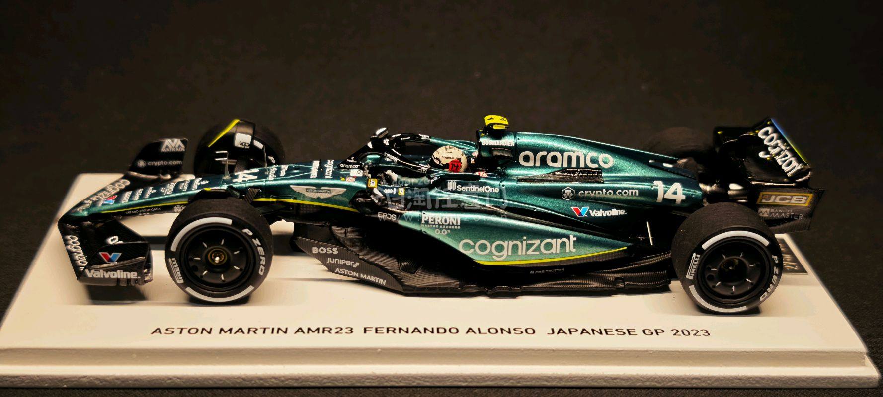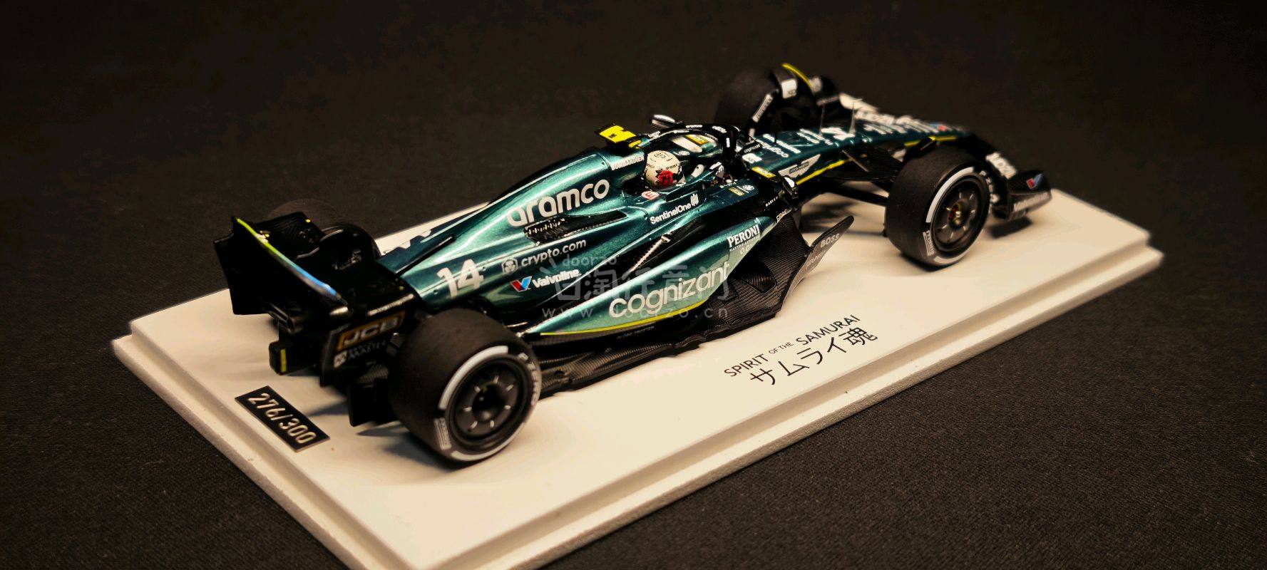 ?️ 阿斯顿马丁AMR23 阿隆索 2023日本站 这是一台来自高端模型品牌 Spark(77 Collection系列) 的1/43比例F1赛车模型,具体信息如下: ? 核心信息 - 车型:Aston Martin AMR23 - 车手:费尔南多·阿隆索(Fernando Alonso) - 赛事:2023年日本大奖赛(Japanese GP 2023) - 涂装主题:“Spirit of the Samurai”(武士之魂) - 限量:全球仅300台,这台是第276台(276/300) - 车号:14号 - 涂装还原:完美复刻了阿斯顿马丁在2023日本站推出的“武士之魂”特别涂装,金属绿车身搭配黑色碳纤维部件,视觉效果极具质感。 - 细节丰富:车身布满了Aramco、Cognizant、Valvoline等赞助商的精细水贴,前翼、尾翼和底板的空气动力学结构也得到了精准还原。 - 收藏价值:作为300台限量款,且是阿隆索在阿斯顿马丁时期的重要分站纪念,稀有度和纪念意义都非常突出。