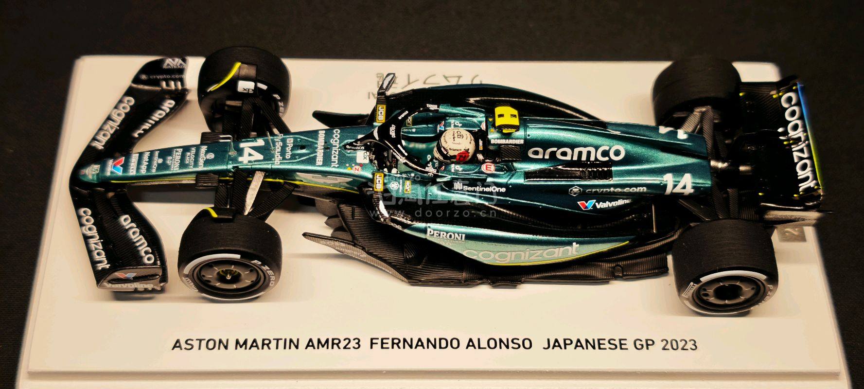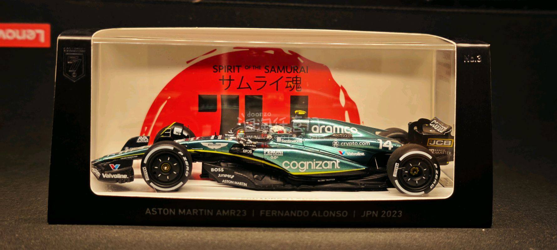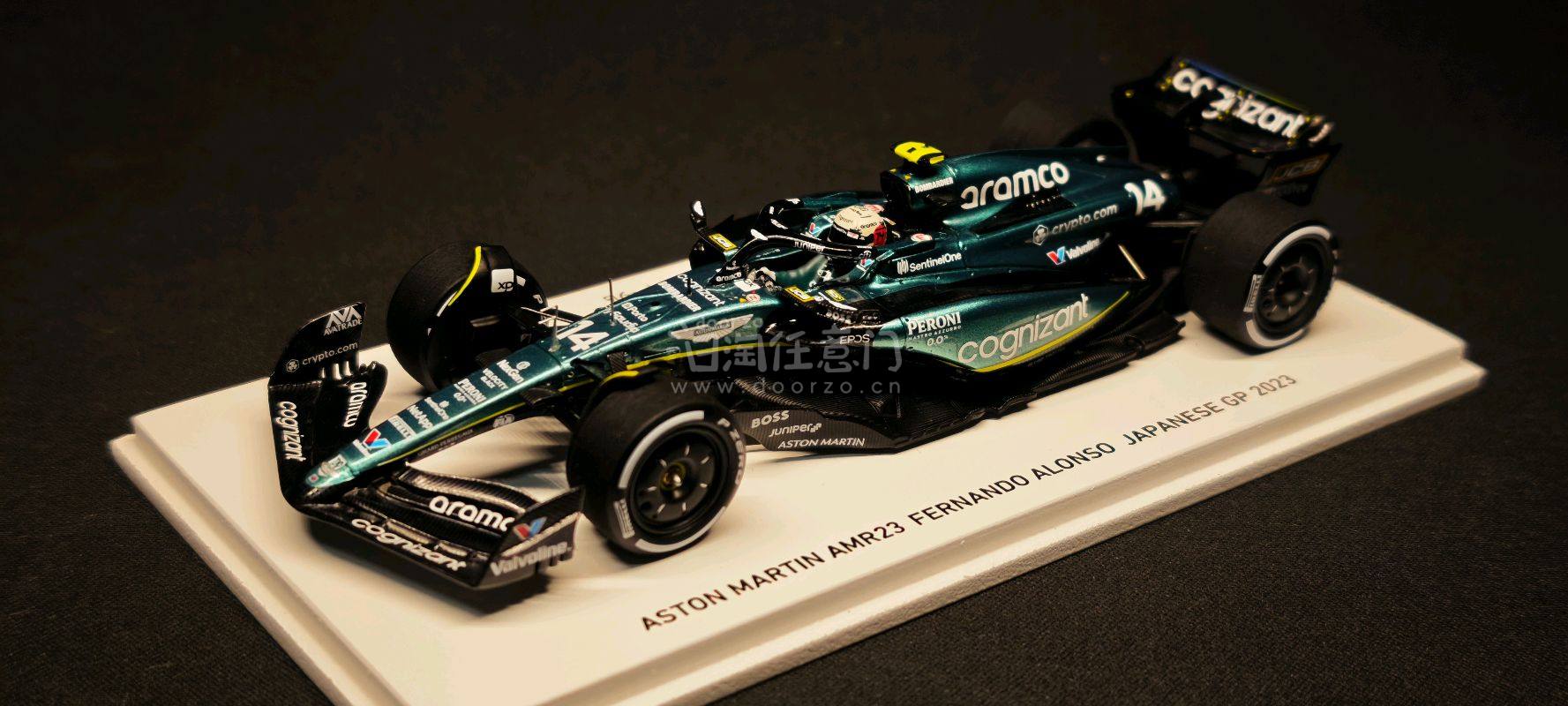 ?️ 阿斯顿马丁AMR23 阿隆索 2023日本站 这是一台来自高端模型品牌 Spark(77 Collection系列) 的1/43比例F1赛车模型,具体信息如下: ? 核心信息 - 车型:Aston Martin AMR23 - 车手:费尔南多·阿隆索(Fernando Alonso) - 赛事:2023年日本大奖赛(Japanese GP 2023) - 涂装主题:“Spirit of the Samurai”(武士之魂) - 限量:全球仅300台,这台是第276台(276/300) - 车号:14号 - 涂装还原:完美复刻了阿斯顿马丁在2023日本站推出的“武士之魂”特别涂装,金属绿车身搭配黑色碳纤维部件,视觉效果极具质感。 - 细节丰富:车身布满了Aramco、Cognizant、Valvoline等赞助商的精细水贴,前翼、尾翼和底板的空气动力学结构也得到了精准还原。 - 收藏价值:作为300台限量款,且是阿隆索在阿斯顿马丁时期的重要分站纪念,稀有度和纪念意义都非常突出。