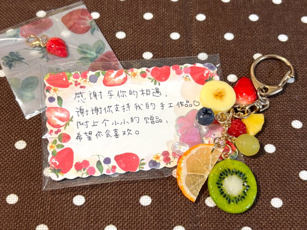 终于买到了心心念念的树脂粘土水果挂件,包装很严肃,一点磕碰都没有,樱花妹还送了超级卡哇伊的小草莓,幸福感拉满!挖煤姬我们喜欢你