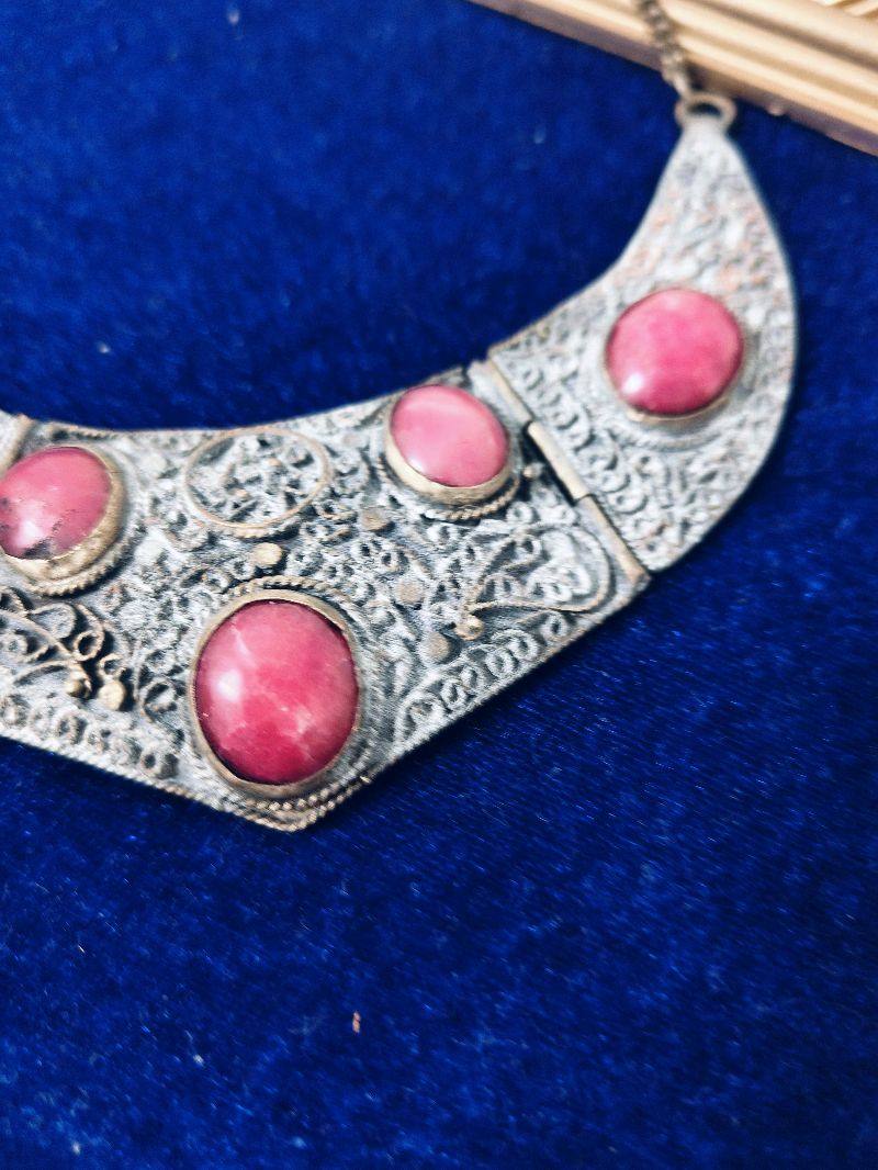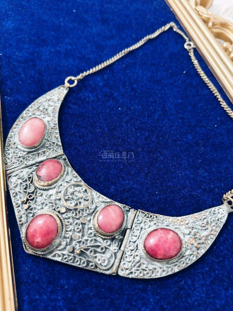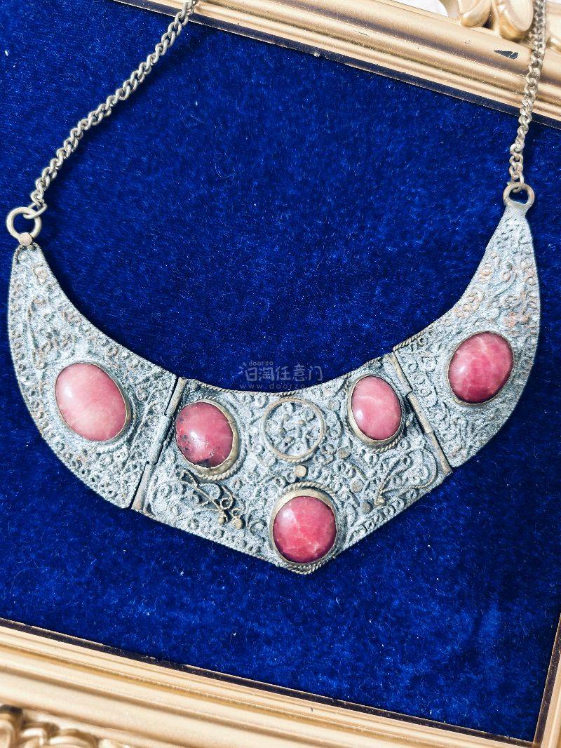 西域遗珍,花丝为骨。这抹颈间的绯红,是游牧文明的浪漫注脚。手工錾刻的缠枝纹里,藏着旧时光的温度,五颗胭脂色宝石在时光里沉淀出醇厚的包浆,无需多言,皆是可佩戴的史诗。 不是所有首饰都能承载岁月。银胎鎏金的温润,花丝镶嵌的繁复,历经百年依旧轮廓分明。它曾见证过草原的风,冥冥中遇到了我这个新主人