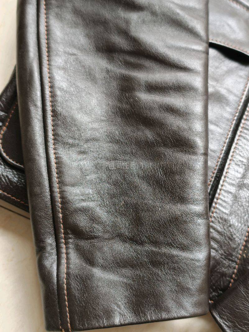 挖煤姬海淘的这件皮夹克质感十足,深棕色皮革带有自然的油蜡褶皱,复古风范浓郁。做工扎实,缝线工整均匀,金属扣件和调节带等细节处理到位。经典翻领和胸前口袋设计百搭,整体版型挺括。从包装到实物都与描述一致,是一次满意的购物体验,期待秋冬搭配出街。从发货到收货体验挺好的,以后会再买。