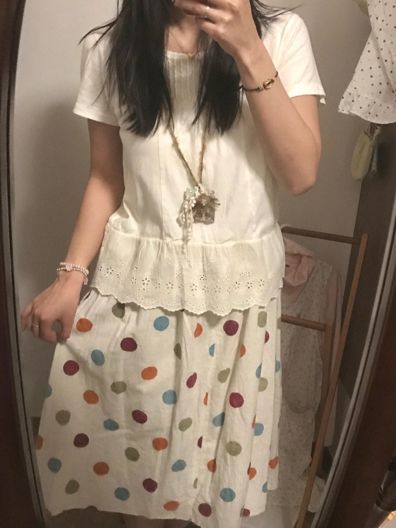 这个彩色波点半裙太美了 但可惜里面内衬坏了 卖家没有说明 但是不太影响穿 白色波点长裙也很好看 衬衣领子很特别