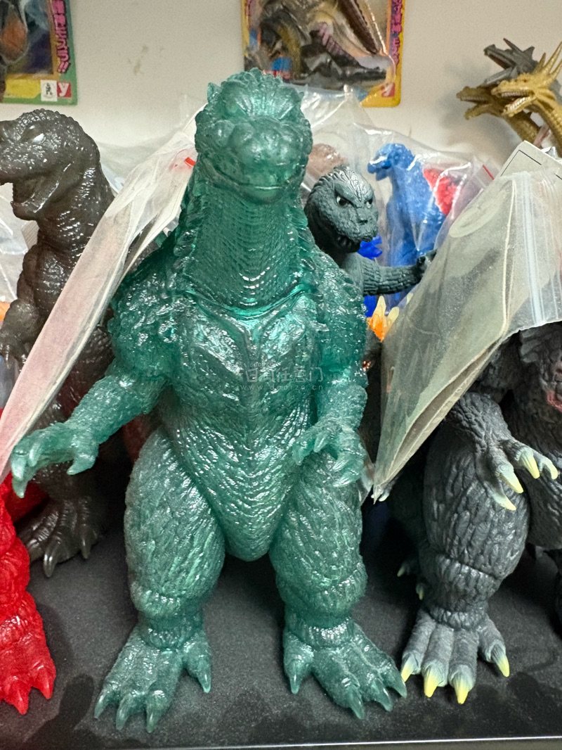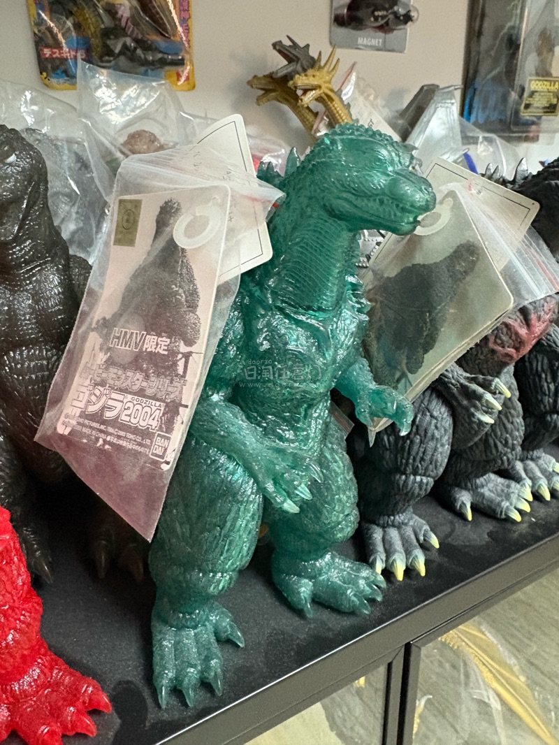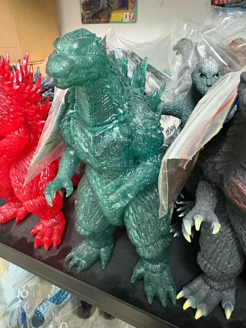 这是2004年终焉哥斯拉的HMV限定透明绿款软胶,半透绿闪材质自带光泽感,肌肉纹理与背棘细节还原到位,限定身份让它在收藏圈里辨识度和价值都很高。