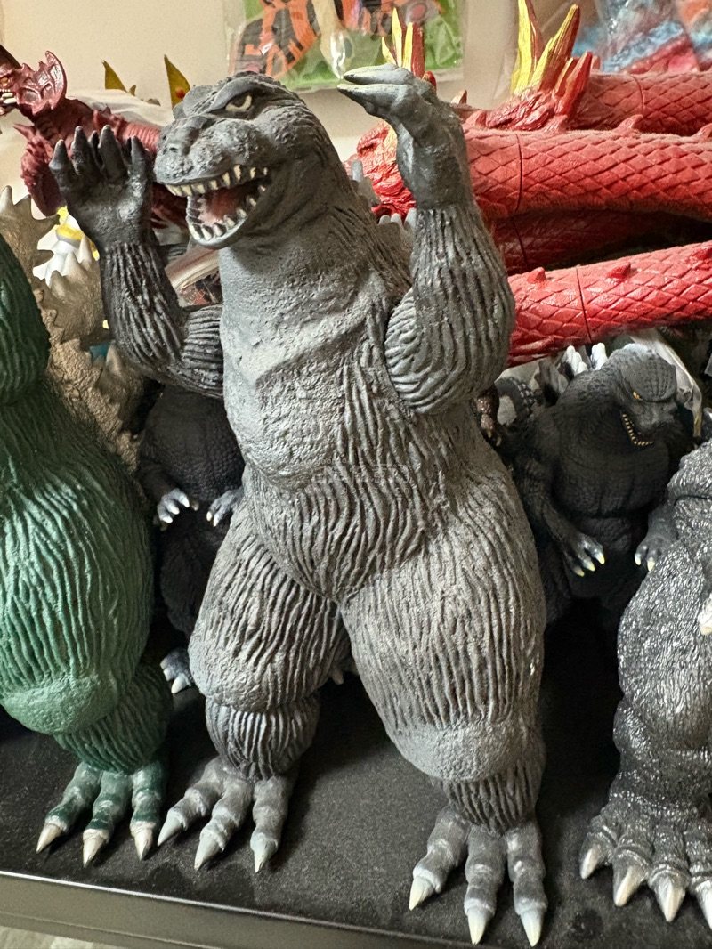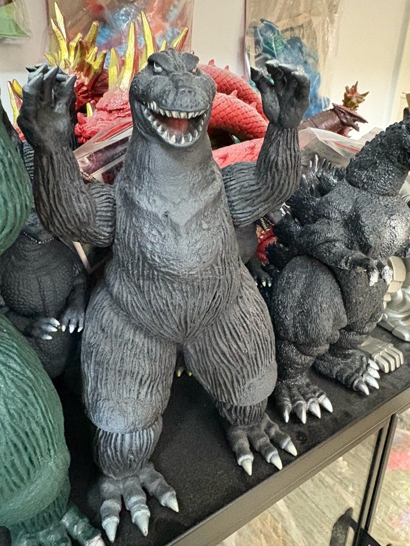 这是1962版金刚大战哥斯拉造型的哥斯拉软胶,属于经典复古款。 通体灰黑配色,皮肤布满纵向纹理,双臂抬起的姿态还原了影片中与金刚对峙的经典场景,肌肉线条与爪部细节刻画扎实,是哥斯拉系列早期形象的代表性周边,收藏与怀旧价值突出。