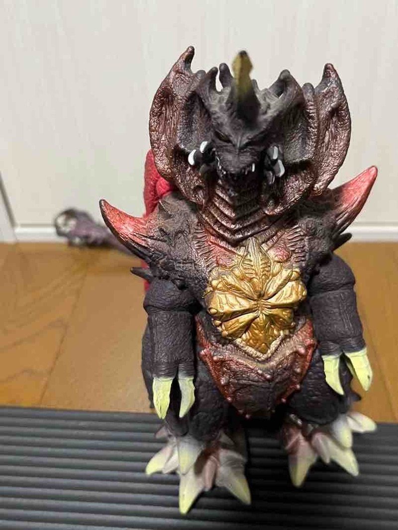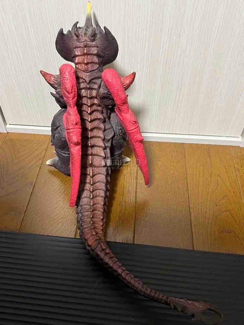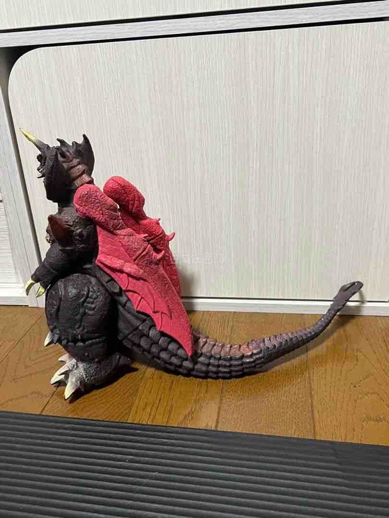 这款戴斯特洛伊亚软胶,以黑红为主色调,背部鲜红翼状结构与渐变尾脊极具张力。头部尖角与狰狞利齿还原度拉满,胸口金色纹路与全身粗糙鳞片纹理刻画细腻,压迫感十足,是怪兽收藏中的经典反派款。1995年发售
