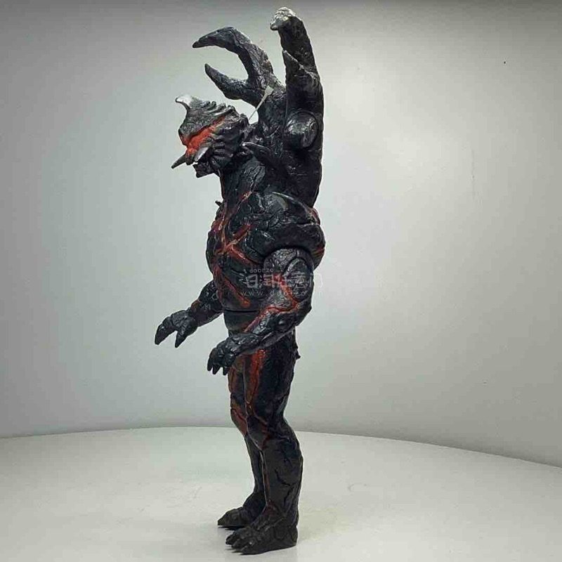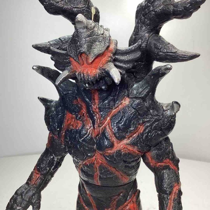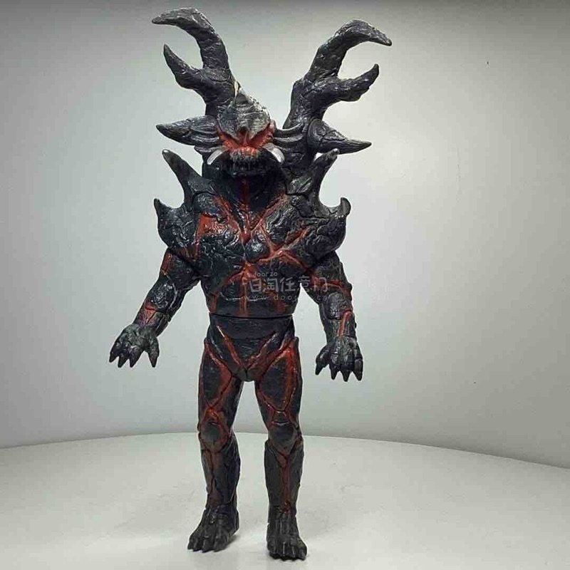 这款怪兽软胶通体焦黑底色搭配烈焰般的红纹涂装,造型极具压迫感。头部尖锐突起与獠牙狰狞恐怖,身体布满粗糙的岩石质感纹理,背后巨大的棘刺结构霸气十足,整体尽显黑暗系怪兽的狂暴与诡异,是特摄收藏中风格强烈的一款。