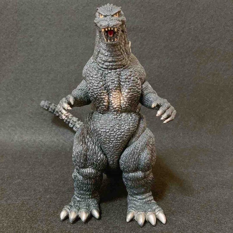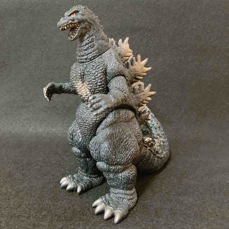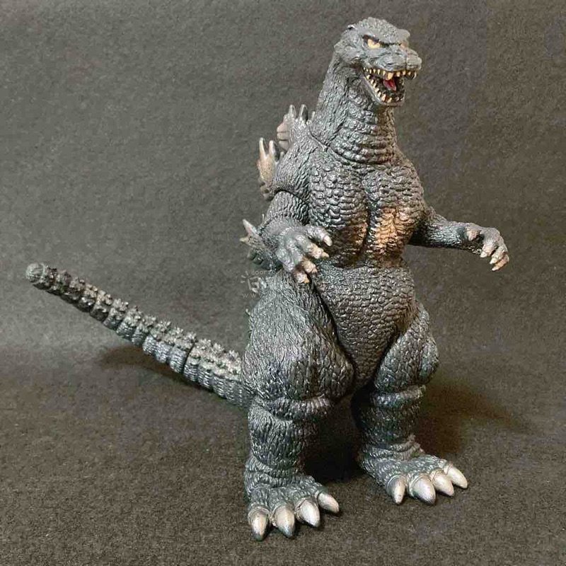 这款经典哥斯拉软胶通体深灰哑光质感,鳞片纹理细密立体,背鳍与爪部银灰点缀,胸肌处做旧提亮,姿态威严,是还原度极高的复古收藏款。