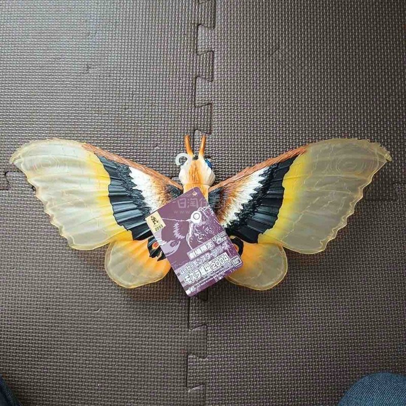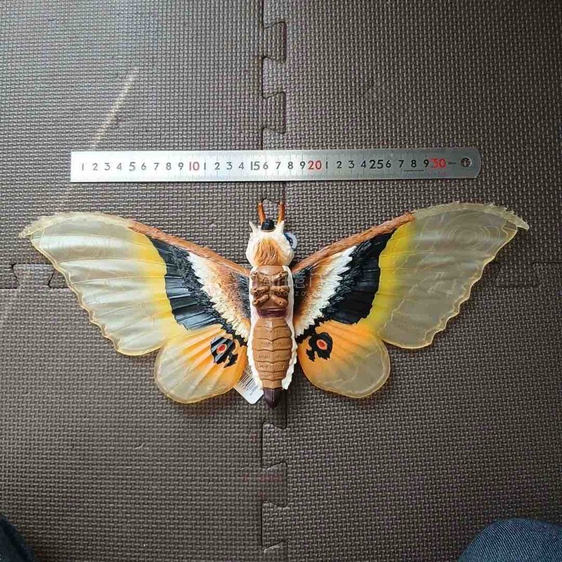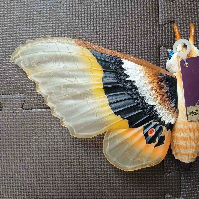 这款摩斯拉软胶翼展宽大,半透翼面纹理细腻,黄黑橙三色渐变层次丰富,眼状斑纹醒目生动,躯体绒毛质感与复眼细节刻画精致,尽显守护女神的华贵与灵动,是极具视觉美感的收藏款。