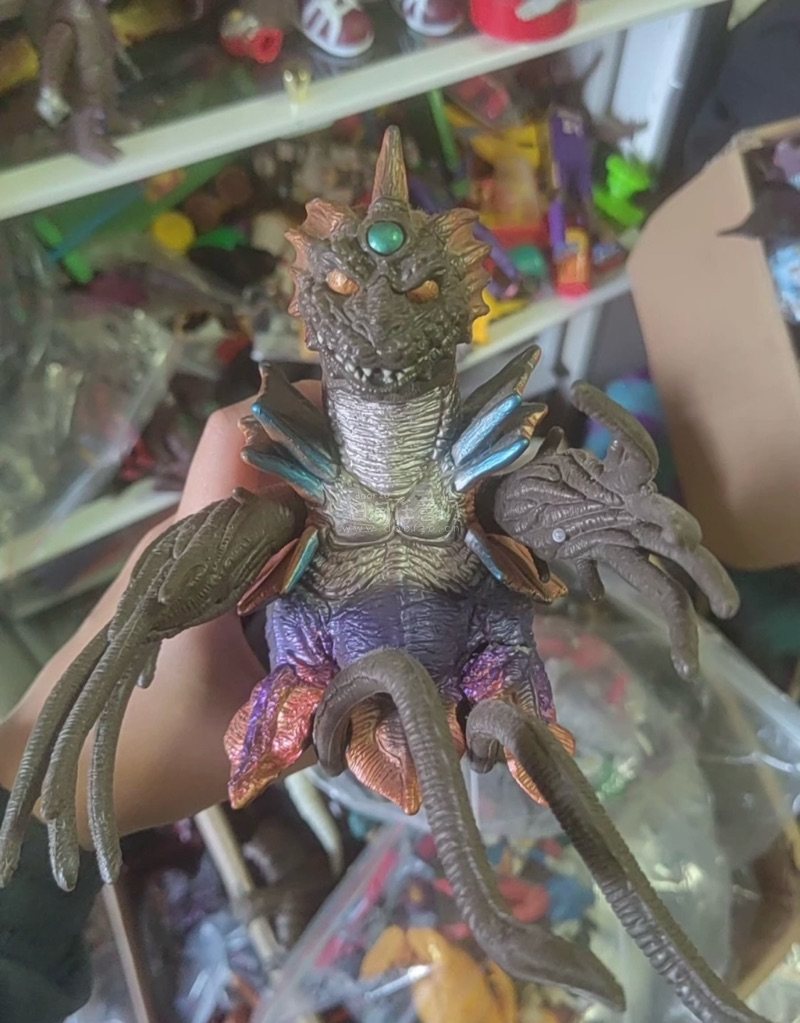 这款怪兽手办造型诡谲奇幻,渐变紫棕配色与鳞甲质感拉满,头顶绿宝石与多肢长尾设计充满克苏鲁式压迫感,细节繁复,视觉冲击力极强。