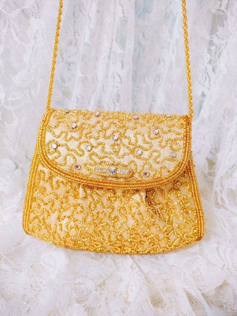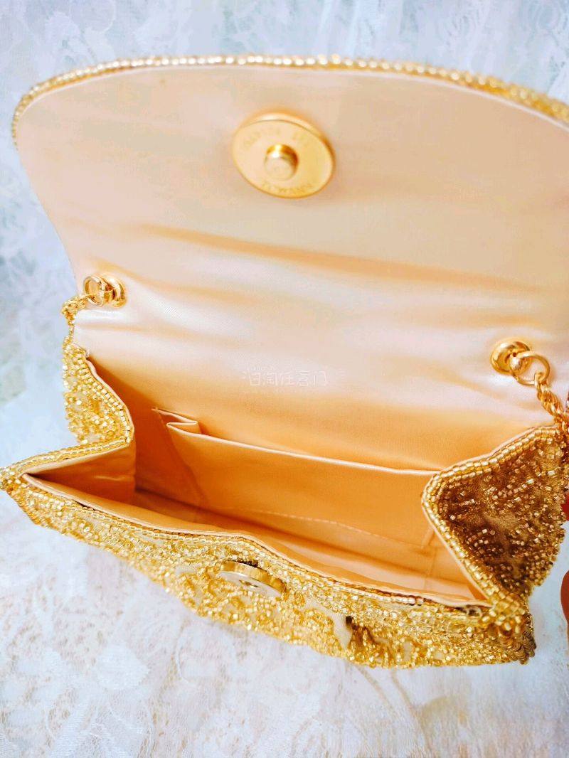 感谢挖煤姬让我遇到这么美的包 lumy已绝版的古董包 一只全新无暇的lumy包包 包身整体面料是哑光金丝 很高级的金属光泽感 包身上手工刺绣蜿蜒如水流一般 珠子是刻面灌金珠 很闪很亮