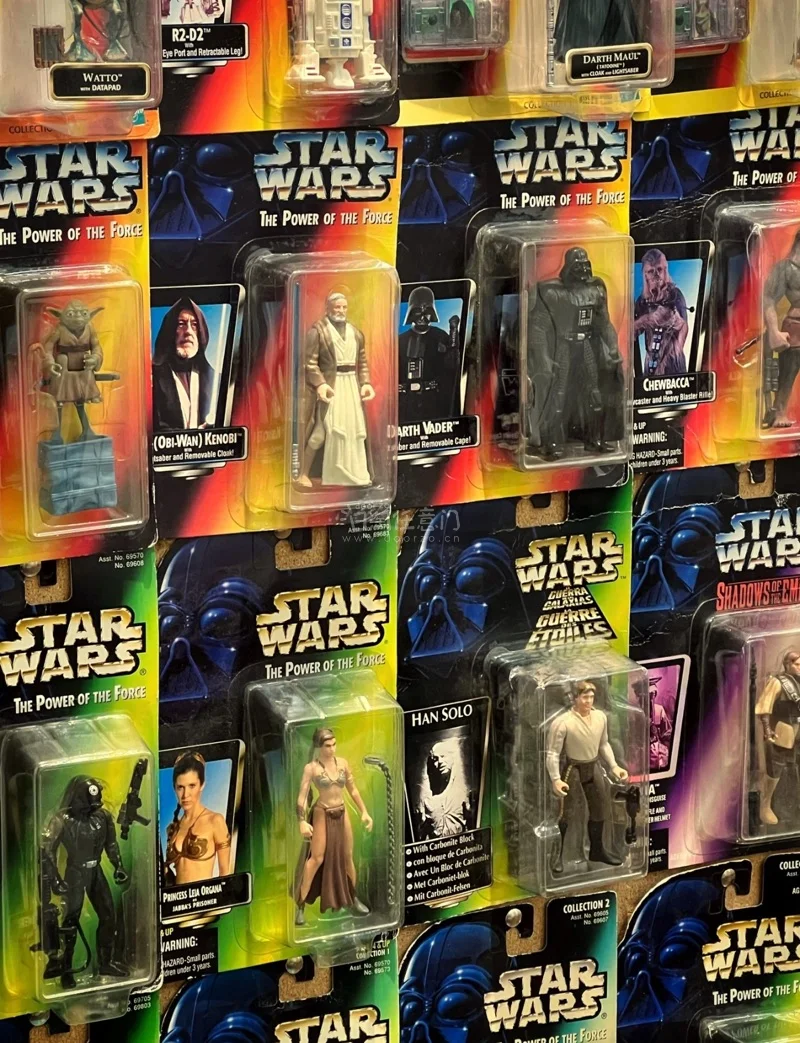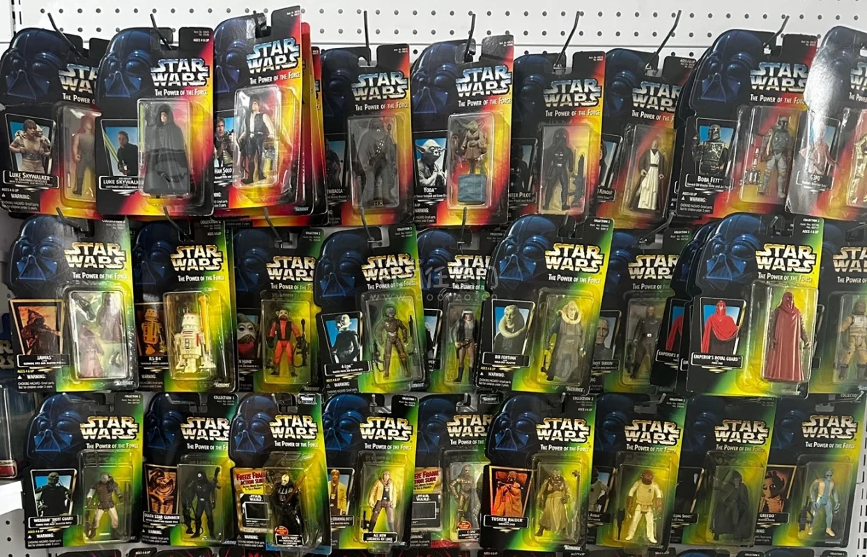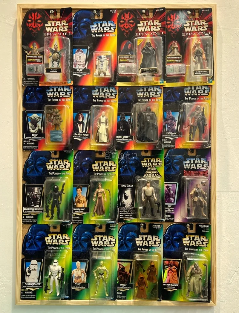 全是90年代末《The Power of the Force》系列的经典款:霍斯星卢克、沙地兵、Tusken Raider、AT-AT驾驶员…每一个都原封未拆,蓝黑头盔包装+复古绿卡背,这就是星战玩具的黄金时代啊! 看着这一箱满到溢出来的老库存,瞬间梦回小时候攒零花钱买玩具的日子,这种复古质感和收藏感,真的是现在新品比不了的? 我把他们都挂在墙上弄一个挂卡墙真的不要太帅了!我还弄了一个挂卡相框太好看了!!感谢挖煤姬!