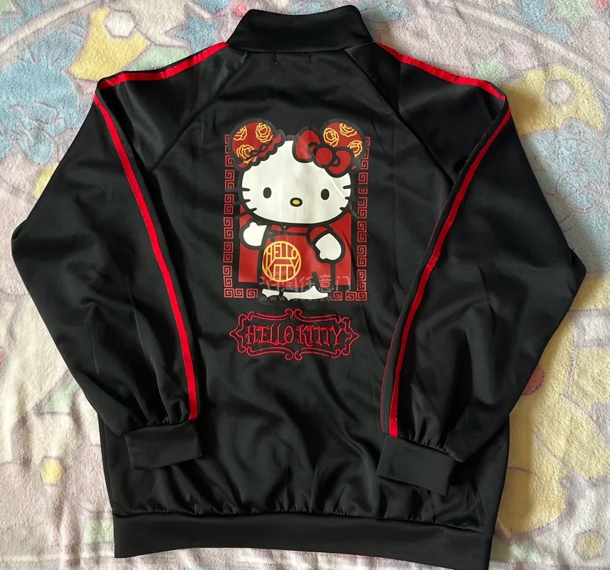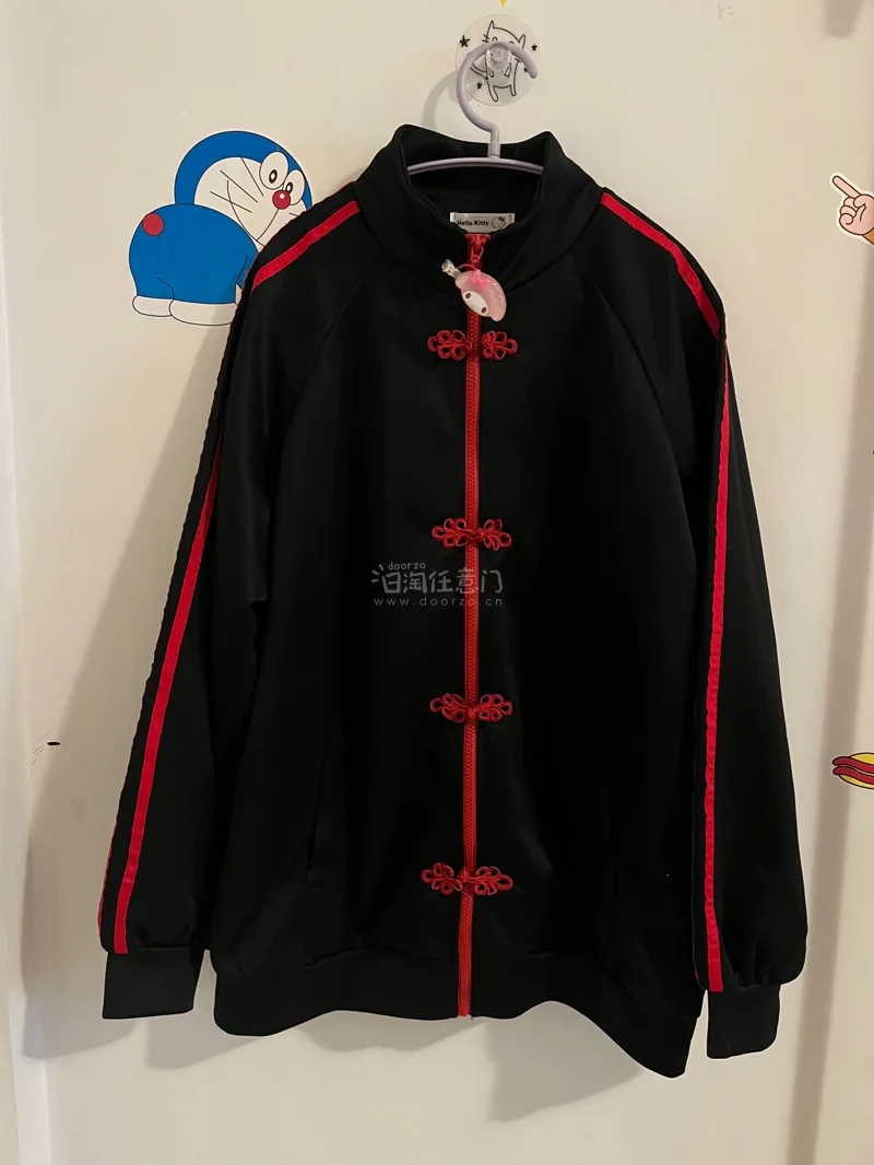 这次买的是一件中国风盘扣黑色外套,薄薄一层很适合现在的天气,背后还有Kitty印花,特别可爱的包子铺老板装扮。美乐蒂立体发夹更是粉嫩美萌,透明部分还有闪闪的亮片,实用美观。