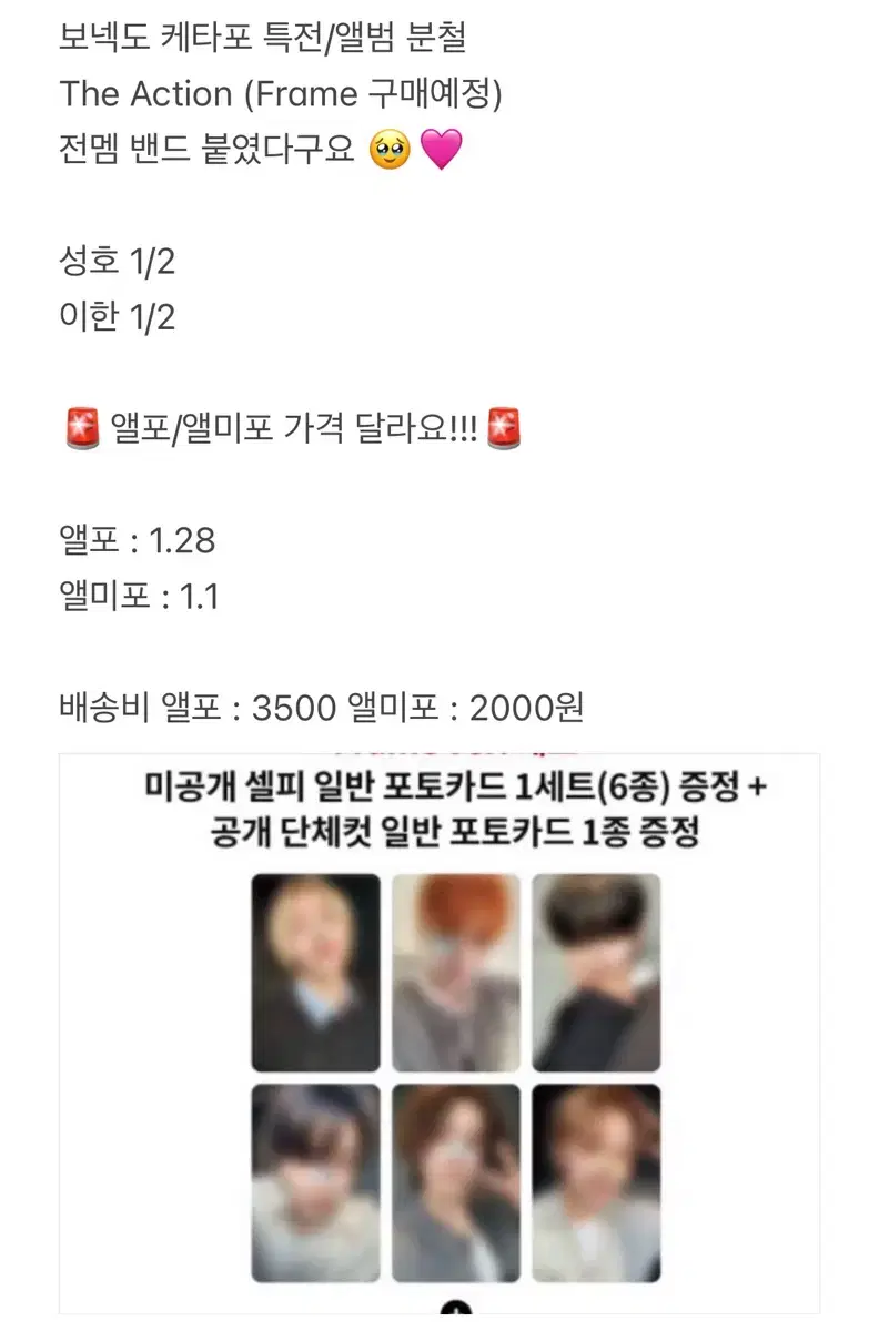 안전결제전 꼭 번개톡 먼저 주세요!!!ㅜㅜ 보넥도 케타포 특전/앨범 분철 The Action (Frame 구매예정) 전멤 밴드 붙였다구요 🥹🩷 성호 1/2 이한 1/2 🚨앨포/앨미포 가격 달라요!!!🚨 앨포 : 1.28 앨미포 : 1.1 배송비 앨포 : 3500 앨미포 : 2000원