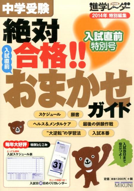 1プロローグ ・合格のために 最も大切なことは 保護者の“サポート力”!2おまかせ スケジュール ・まずは、全体の流れを確認! ・月別カレンダー形式 スケジュール表を作ってみよう ・月別モデルカレンダー 11月 12月 1月 2月 ・とじこみ「“おまかせ”スケジュール表」を こう使えば、入試の予定はばっちり!3おまかせ 願書の書き方&出願方法 ・願書の書き方 ・願書の記入例 ・実際に先輩保護者が書いた「志望理由」の実例集 ・出願方法 ■出願時に整理券を発行する学校4おまかせ 入試本番 ・入試前日 ・入試当日・朝 ・家出発〜学校到着 ・試験開始 ■入試当日の保護者の控え室はどこ? 当日、入試問題は公表される? ・午後入試 ・面接 ・帰り道〜帰宅後 ■先生に聞いた 入試当日は、こんなことに注意してください ・合格発表〜入学手続き5おまかせ ヘルスケア&生活・メンタルケア ・ヘルスケア ・食事 ・生活・ヘルスケア ■先輩保護者に聞いた 入試直前 子どもにこんな声をかけました! ・先輩保護者に聞いた 楽しく受験を乗り切るための わが家の“ヒケツ”“モットー”はコレ! ・先生も応援しています がんばれ! 中学受験生6おまかせ“サンデーチャンス”で最後の併願作戦 ・志望校決定〜あなたの併願校は本当に大丈夫!?〜 ・2015年は“サンデーチャンス”でこうなる! ・併願の組み方 ・“直前説明会”&“行事”の活用法 ■学校説明会はこう見て、こう聞こう! ■先生も応援しています 11月以降「直前ならでは」「特にオススメ」の行事は? ・こんな学校なら行ってみたい!〜タイプ別おすすめ実力校〜 ・先輩保護者に聞いた 現在通っている学校で、予想以上に良かったことや 満足していることは?7おまかせ“大逆転”の学習法 ・日能研の先生に聞いた 偏差値5ポイントアップの学習法 算数 国語 ・まだ間に合う 苦手・弱点克服法 社会科 理科 ・成績Up Downでどうする? ・日能研の先生に聞いた 時事問題 2015年入試はコレがポイント! 〜日能研『重大ニュース』を上手に活用しよう!!〜