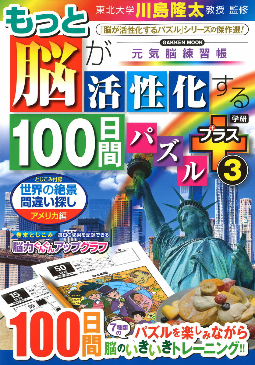 脳トレの第一人者、東北大学の川島隆太教授・監修のロングセラー「脳が活性化するパズル」シリーズの最新刊。脳の活性化に効果があることが実験を通してわかった人気のパズル、クロスワード、ナンプレ、間違い探し、漢字ナンクロ等を100問収録。楽しみながら脳の活性化に取り組むことができる。さらに今シリーズでは巻末とじこみ付録として写真による「世界の絶景 間違い探し」をプラス。イラストとは異なり、細部に至るまで奥行きと広がりを持ってリアルに再現されているところが写真による間違い探しの大きな魅力。その一方で、省略されている部分がないため、違いを見つけるのが大変ということがある。そこで、本書の付録では、あらかじめ写真を分割し、分割したエリアごとに違いを見つけて解き進めるように工夫。これにより集中力を途切らせることなく、最後まで解けるようになっている。100日間分のパズルに加え、付録で集中力を高めることで、さらに脳トレ効果のアップが見込める。世界の絶景、今回はアメリカをテーマにしたもので構成。自由の女神像・ワシントンの桜・ヨセミテ国立公園の大自然・モニュメントバレー等々、間違い探しパズルを解きながら旅する気分も味わえるようになっている。