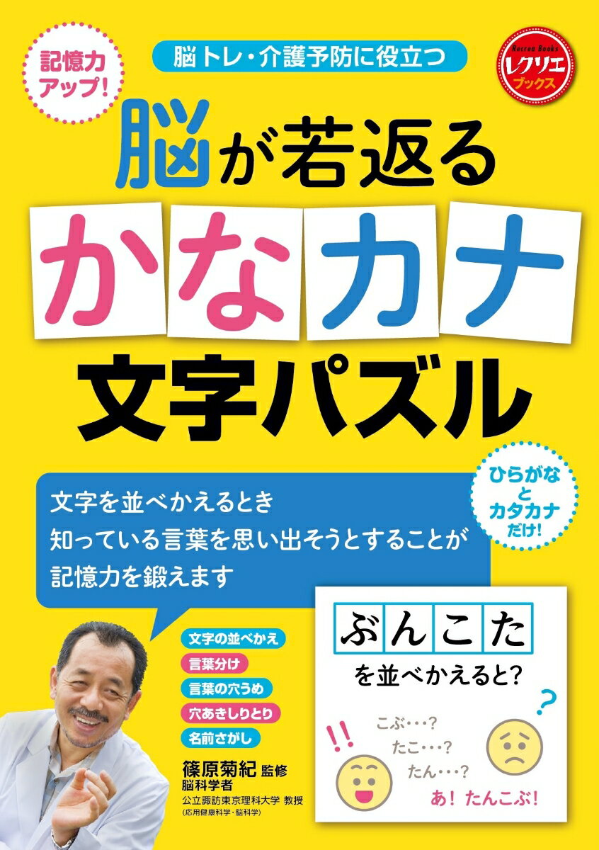 ・ひらがなとカタカナだけの文字の脳トレブック。・文字を並べかえたりつなげたりするだけ。知識は問いません。・知っている言葉を思い出そうとすることが記憶力を鍛えます。ひらがなとカタカナだけの文字の脳トレブックです。解くときに特別な知識は必要ありません。文字を並べかえたりつなげたりすることで、自然に答えにたどりつきます。日ごろ使っている言葉を思い出そうとすることが記憶力を鍛えます。脳科学者、篠原菊紀先生監修のもと、脳トレに最も効果的な「やさしすぎず」「むずかしすぎない」問題となっています。ぜひこの本で脳トレ習慣を身につけて、毎日を生き生きと過ごしてください。文字の並べかえ 3文字を並べかえよう 4文字を並べかえよう 5文字を並べかえよう 6文字を並べかえよう 7文字を並べかえよう 並べかえて季節の言葉をつくろう言葉分け 2つの言葉をつくろう バラバラ文字をつなごう言葉の穴うめ 1文字入れよう 〇に入る文字は? 輪になった言葉は?穴あきしりとり しりとりでつなごう名前さがし 名前を見つけよう 組み合わせて名前をつくろう