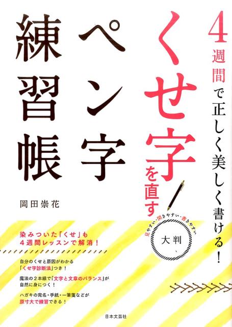 染み付いたくせを4週間で直し、美しい文字が書けるようになる書き込み式練習帳です。開きやすく、見やすく、書きやすいのが嬉しい大判サイズ。美しい文字に定評のある著者が、くせの自己診断法と練習法を丁寧にレッスンします。本書の特徴よくわかる「くせ字」診断法くせのない美文字のルールはたったの5つ!ペンの種類と選び方正しいペンの持ち方と姿勢まっすぐな線は基本第1週 カタカナ/ひらがな 第2週 漢字 第3週 苗字、名前、地名、数字とアルファベット 第4週 封筒の宛名、手紙文、一筆箋、季節の便り、履歴書、送り状など練習用シート