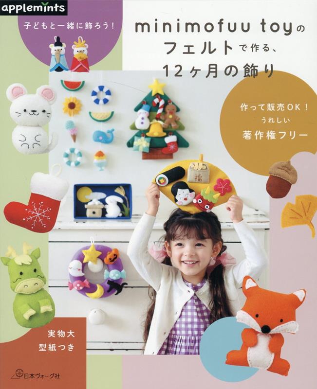 フェルト型紙作家として人気のminimofuu toyさんのワンマンブック。12ヶ月をテーマに、お部屋を飾るフェルトの作品集。作品は全て作って販売OKの著作権フリー。1月は十二支、2月は節分、3月は桃の節句、4月はイースター、5月は端午の節句、6月は雨と虹、7月は七夕、8月はサマーバケーション、9月はお月見、10月はハロウィン、11月は秋の風景、12月はクリスマスのラインナップ。どれも簡単で作りやすい作品ばかり。作品に出てくる平面のマスコットは、ブローチピンをつければブローチに、ひもをつければオーナメントやチャームに展開も可能。フェルトはミニーフェルトをメインに使用し、色見本を見開きで紹介。