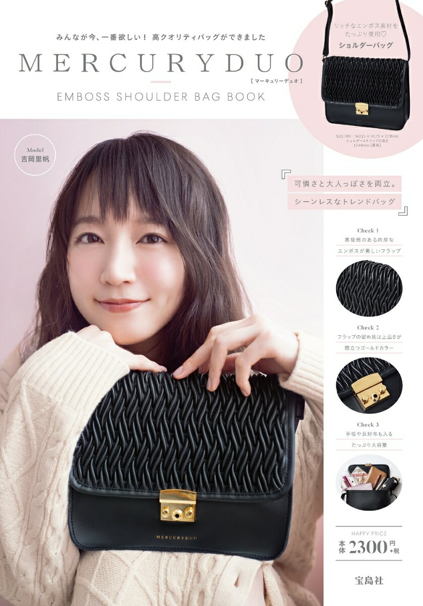 \いま、みんなが一番欲しいバッグができました!/ 大人気ファッションブランド 「MERCURYDUO(マーキュリーデュオ)」から 肉厚リッチなエンボス使いが可愛い❤ シーンレスで使えるショルダーバッグが登場!ツヤのある上質なレザー調のショルダーバッグは フラップにエンボス加工を施し、リッチさをプラス。 ブラック×ゴールドで、甘さをおさえ、 可憐さと大人っぽさが両立するデザインに仕上げました。 ===POINT=== ■高級感のある、肉厚なエンボスが美しいフラップ ■フラップの留め具は、上品さが際立つゴールドカラー ■留め具はワンタッチで開閉もらくらく!■手帳サイズ、長財布などおでかけアイテムが収納できるたっぷり大容量 ■コンパクトな見た目ながら、長財布や500mLペットボトルもすっぽり ■フラップがバッグの中見え、中身の飛び出しを防止 ■ショルダーストラップは長さ調節可能なアジャスター付き。最長1240mmなので高身長さんも安心。 ■ブランドロゴは金具と合わせたゴールドカラーのリッチな箔押しでオン ========== 持つだけでおしゃれに決まるエンボスショルダーバッグは オン・オフどちらも大活躍。 本誌だけのスペシャルアイテムをお見逃しなく。 SIZE(約): W215×H175×D70mm ショルダーストラップの長さ1240mm[最長] ※バッグ以外は商品に含まれません