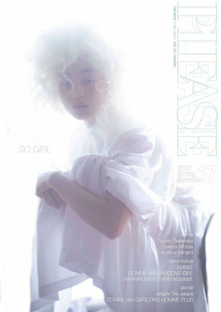 この春のPLEASEはガーリーをテーマに第一特集を組みました。以下は目次と同じですが、見応えたっぷりの一冊に仕上がった!南琴奈さんのSO GIRLは<CHANEL><DIOR><Alexander McQueen>をはじめ、国内外の人気ブランドをガーリーに着こなしてくれた。「Serena In Wonderland」と題したモトーラ世理奈さんのガールストーリーは物語の世界をグラフィカルに。PLEASEではお馴染みの<COMME des GARCONS GIRL>もガール感満載!真っ白な世界でモトーラ世理奈さんが着る<COMME des GARCONS COMME des GARCONS>。<CHANEL>最新作を独特な世界観で撮影。モデルは遠藤さくらさん。PLEASEに突然届いた珈琲豆。そこから始まる<coffee 5>との出会いの旅行記。<COMME des GARCONS>2022春夏のショーをPLEASEらしいビジュアルで格好良く。大橋トリオさんが<COMME des GARCONS HOMME PLUS>を颯爽と着こなしてくれた!「コロタイプ印刷」は150年の歴史を持つ素晴らしい表現力を持った印刷。アーティスト・市川孝典さんの作品をするということで、京都まで追っかけ取材!<JUNYA WATANABE>の2022春夏のショーもエレガントなビジュアルで!<TAKAHIROMIYASHITATheSoloist.>の2022春夏を独自の撮影感でご紹介!竹中直人さんは大人の不良をテーマに<sacai><UNDERCOVER>など人気のブランドで演出!<noirkeininomiya>2022春夏のショーの世界観をシンプルに強くビジュアライズ。レースのジレや襟といった小物をスタイリッシュに。ボリューム満点、春の「PLEASE 17」です。南琴奈さんのSO GIRLは<CHANEL><DIOR><Alexander McQueen>をはじめ、国内外の人気ブランドをガーリーに着こなしてくれた。「Serena In Wonderland」と題したモトーラ世理奈さんのガールストーリーは物語の世界をグラフィカルに。PLEASEではお馴染みの<COMME des GARCONS GIRL>もガール感満載!真っ白な世界でモトーラ世理奈さんが着る<COMME des GARCONS COMME des GARCONS>。<CHANEL>最新作を独特な世界観で撮影。モデルは遠藤さくらさん。PLEASEに突然届いた珈琲豆。そこから始まる<coffee 5>との出会いの旅行記。<COMME des GARCONS>2022春夏のショーをPLEASEらしいビジュアルで格好良く。大橋トリオさんが<COMME des GARCONS HOMME PLUS>を颯爽と着こなしてくれた!「コロタイプ印刷」は150年の歴史を持つ素晴らしい表現力を持った印刷。アーティスト・市川孝典さんの作品をするということで、京都まで追っかけ取材!<JUNYA WATANABE>の2022春夏のショーもエレガントなビジュアルで!<TAKAHIROMIYASHITATheSoloist.>の2022春夏を独自の撮影感でご紹介!竹中直人さんは大人の不良をテーマに<sacai><UNDERCOVER>など人気のブランドで演出!<noirkeininomiya>2022春夏のショーの世界観をシンプルに強くビジュアライズ。レースのジレや襟といった小物をスタイリッシュに。ボリューム満点、春の「PLEASE 17」です。