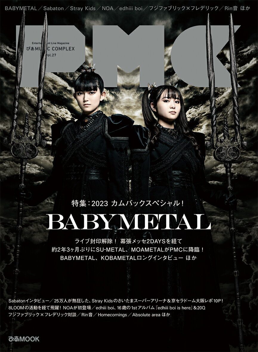 BABYMETALが表紙を飾る『ぴあMUSIC COMPLEX(PMC) Vol.27』発売!NOA、edhiii boiら登場。Stray Kidsレポも3月10日(金)、BABYMETALが表紙を飾る『ぴあMUSIC COMPLEX(PMC) Vol.27』が発売。今号では、1月28・29日に千葉・幕張メッセ国際展示場で開催された「BABYMETAL RETURNS -THE OTHER ONE -」で、約1年9ヶ月ぶりにライブを行ったBABYMETALが表紙・巻頭特集に登場。これまで語ってこなかった2021年の日本武道館10公演、ライブ活動の封印、そして今回の幕張メッセ2DAYSでの復活から、4月1・2日に行われる「BABYMETAL BEGINS - THE OTHER ONE -」に至るまでを率直に語ったSU-METALとMOAMETALのロングインタビューに加え、3月24日リリースのコンセプトアルバム『THE OTHER ONE』全曲解説というトータル25000文字に及ぶ言葉と、約束の思いを込めた迫力の撮り下ろしグラビアで届けます。さらにKOBAMETALが語る“BABYMETAL IS BACK!!”と“THE OTHER ONE”、フルキャパ&声出しが急遽可能になるという奇跡が起きた幕張メッセ2DAYSのライブレポート、読者アンケートも含め、充実の特集に。BABYMETALファンにもおなじみのスウェーデン発のバンド、Sabatonのインタビューも到着。バンドの現在、4月よりBABYMETALがスペシャルゲストとして参加するヨーロッパツアーについて語ってくれました。続いて、昨年、米・Billboard 200で2度の1位を獲得するなど、世界的に旋風を巻き起こしている8人組グループ、Stray Kids。会場・ライブビューイング・配信を加え、4公演で25万人が熱狂した、「Stray Kids 2nd World Tour "MANIAC" ENCORE in JAPAN」の、埼玉・さいたまスーパーアリーナ、そして初の単独ドーム公演となった大阪・京セラドーム大阪のライブレポートを10ページにわたり、お届けします。そして、ドラマ『君の花になる』に登場するボーイズグループ、8LOOMの活動でも話題を呼んだソロアーティストNOA。韓国のYG ENTERTAINMENT初の日本人練習生として在籍した経験があり、日本のみならずアジア圏でも人気を集める彼に、デビューアルバム『NO.A』を中心に話を聞きました。14歳でBMSGと契約し、2022年1月にデビューしたedhiii boiには、16歳の今が詰まった1stアルバム『edhiii boi is here』についての初インタビューを敢行。『PMC』初登場のNOAとedhiii boiにはロングインタビューに加え、素の表情が垣間見える20Q(20問20答)にもトライしてもらいました。さらに、人気バンドのコラボという域を超え、楽曲制作からガッツリとタッグを組み、フジファブリック×フレデリックという7人組バンドとして精力的なコラボを展開している両バンドのフロントマンによる対談、「snow jam」の大ヒット後も福岡在住のままマイペースな音楽活動をつらぬき、等身大の成長を込めたデジタルEP『live in love.』をリリースするラッパーのRin音、結成10周年イヤーに突入したHomecomings、自身最大キャパのライブに挑む3人組、Absolute areaらが登場し、音楽シーンの新たな動きをお届けします!【コンテンツ】表紙 BABYMETAL特集 「2023 カムバックスペシャル!」◎BABYMETAL 新たな伝説の始まり、BABYMETAL IS BACK!!〈SU-METAL、MOAMETALインタビュー〉封印解除後初、幕張2DAYS、鳴り響くBABYMETALコール〈LIVE REPORT〉BABYMETALが語る『THE OTHER ONE』〈SELF LINER NOTES〉“BABYMETAL IS BACK!!” KOBAMETALの証言・読者アンケート◎Sabaton欧州ツアーにBABYMETALが参加、Sabatonのインタビューが届いた◎Stray Kids25万人と奏でる“SOUND”、初のドームを含む再来日公演レポ◎NOA8LOOMの活動を経て、飛躍するNOAの表現 〈ロングインタビュー&20Q〉◎edhiii boi初期衝動あふれる16歳の1stアルバム! 〈ロングインタビュー&20Q〉◎フジファブリック×フレデリック「夢がかなった!」楽曲コラボ、フジファブリック×フレデリック結成!◎Rin音等身大の成長を込めた、心地よい『live in love.』◎PIA SPECIAL PICK UP! Homecomings/Absolute area◎Chim↑Pom from Smappa!Group “エリイの国の人”の習性 ほか※仕様、構成、内容等は変更される場合がありますので予めご了承ください。