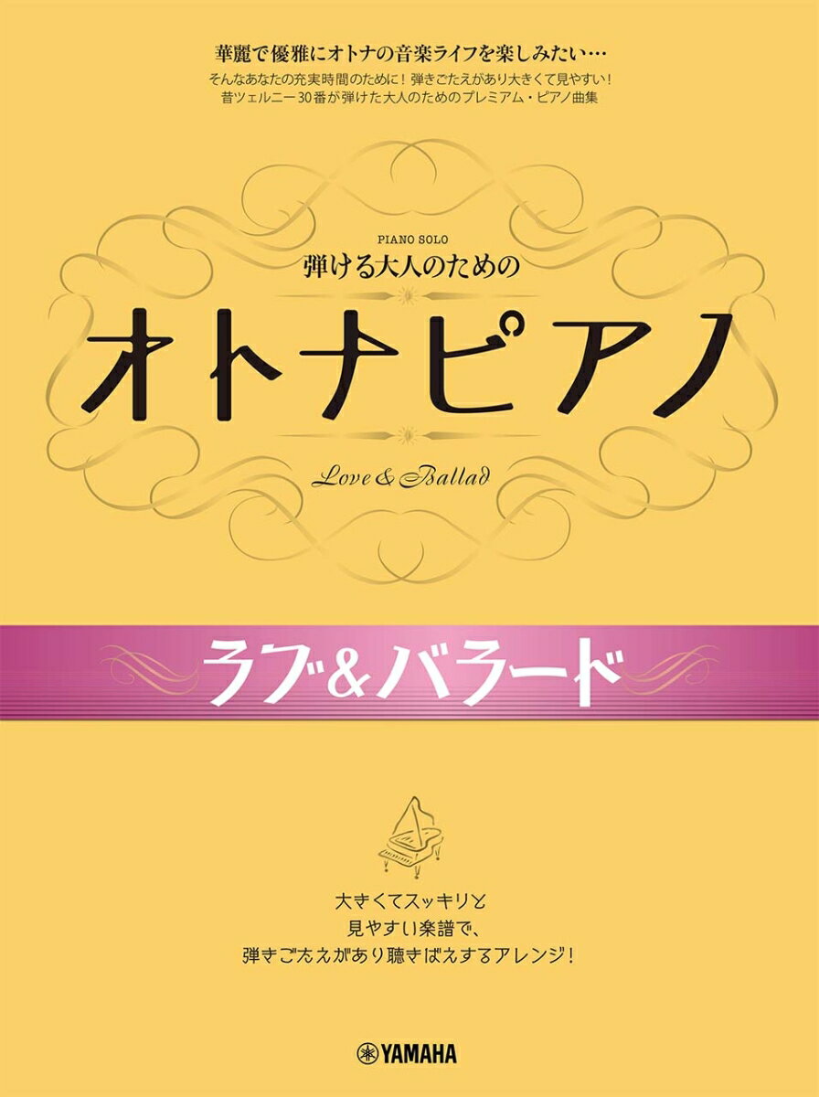 グランドピアノなど、譜面台が遠く前かがみになって譜読みしていることはありませんか?そんな煩わしさを解消してくれるのが本シリーズです。譜玉が大きく、段間も余裕があり、スッキリ見やすい楽譜でお届けします。これで譜読みもよい姿勢のままでできます!昔ツェルニー30番が弾けたピアノ経験者、または中級レベルを弾く大人を対象にしています。華麗で優雅に、大人のピアノ・ライフ、充実時間をお楽しみください!ラブ&バラードではJ-POPを中心に、ディズニー、クラシックなど幅広い18曲を集めました。※本書は「弾ける大人のための オトナピアノ ラブ&バラード」(GTP01090279)と同じ内容です。■収載曲 [全18曲を収載][1] 潮騒のメモリーNHK連続テレビ小説『あまちゃん』より編成: ピアノ・ソログレード: 中級[2] ありがとう / いきものがかり編成: ピアノ・ソログレード: 中級[3] 花は咲く / 花は咲くプロジェクトNHK『明日へ』東日本大震災復興支援ソング編成: ピアノ・ソログレード: 中級[4] 家族になろうよ / 福山 雅治編成: ピアノ・ソログレード: 中級[5] 恋におちてーFall in Love- / 小林 明子編成: ピアノ・ソログレード: 中級[6] Butterfly / 木村 カエラ編成: ピアノ・ソログレード: 中級[7] 糸 / 中島 みゆき編成: ピアノ・ソログレード: 中級[8] 三日月 / 絢香編成: ピアノ・ソログレード: 中級[9] Everything / MISIA編成: ピアノ・ソログレード: 中級[10] オリビアを聴きながら / 杏里編成: ピアノ・ソログレード: 中級[11] ラブ・ストーリーは突然に / 小田 和正編成: ピアノ・ソログレード: 中級[12] めぐり逢い / アンドレ・ギャニオン編成: ピアノ・ソログレード: 中級[13] ホール・ニュー・ワールドA WHOLE NEW WORLD/ディズニー映画『アラジン』より編成: ピアノ・ソログレード: 中級[14] 美女と野獣BEAUTY AND THE BEAST/ディズニー映画『美女と野獣』より編成: ピアノ・ソログレード: 中級[15] 素直になれなくて / シカゴHARD TO SAY I'M SORRY編成: ピアノ・ソログレード: 中級[16] イエスタデイ・ワンス・モア / カーペンターズYESTERDAY ONCE MORE編成: ピアノ・ソログレード: 中級[17] 愛の夢編成: ピアノ・ソログレード: 中級[18] 愛のあいさつ編成: ピアノ・ソログレード: 中級