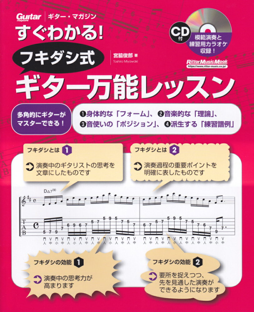 1:【1】シンプルな単音のトレーニング 2:左手の指を均等に鍛えるクロマチック・トレーニング 3:弦移動を伴うクロマチック・トレーニング 4:クロマチックのバリエーション・フレーズ 5:薬指を集中的に鍛えるフレーズ 6:小指を集中的に鍛えるフレーズ 7:ハンマリング集中練習フレーズ 8:プリング集中練習フレーズ 9:ハンマリングとプリングを組み合わせたラン・フレーズ 10:スライドやグリスを駆使したフレーズ 11:連続した異弦同フレット・フレーズ 12:オルタネイト・ピッキング鍛錬フレーズ 13:弦跳びトレーニング・フレーズ 14:ポジション連続チェンジ・フレーズ 15:正確無比なチョーキング・フレーズ 16:高速トレモロ・ピッキング 17:【2】バッキング・フレーズ集 18:パワー・コード・バッキング 19:異弦同フレット型のリフ 20:高音弦を使った複音系リフ 21:必要最小限の音を使ったバッキング 22:ヘヴィメタル・バッキング 23:ブルースの常套的バッキング 24:【3】ソロ・フレーズ集 25:1音チョーキングを駆使した定番ソロ 26:半音チョーキングを取り入れた泣きのフレーズ 27:多様なチョーキングを取り入れたソロ 28:ハーモナイズド・チョーキングを効果的に取り入れたソロ 29:泣きのビブラート・フレーズ 30:ロックンロール定番のソロ 31:カントリー系定番のフレーズ 32:スウィープ・ピッキングを取り入れたフレーズ 33:エコノミー・ピッキングを取り入れたフレーズ 34:ドリアン・スケールを用いたフレーズ 35:ミクソリディアン・スケールを用いたフレーズ 36:コード・アルペジオを駆使したソロ 37:ジャズ定番のソロ・フレーズ 38:スケール・チェンジを含むソロ 39:【4】カッティング・フレーズ集 40:16ビートさわやかカッティング 41:単音カッティング・フレーズ 42:単音ミュート・カッティング・フレーズ 43:キレキレのファンキー・カッティング 44:3連系のカッティング 45:単音と複音を組み合わせた多彩なカッティング 46:(column) 演奏中の思考について 47:教則本を20年書いてきて思うこと 48:本書と併読してもらいたい教則本