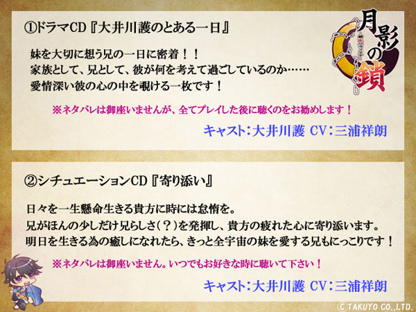 [ドラマCD]は主人公の兄・大井川護(Vo.三浦祥朗)のとある一日を描いたドラマ、[シチュエーションCD]は大井川護の『寄り添い』シチュエーションボイスです。