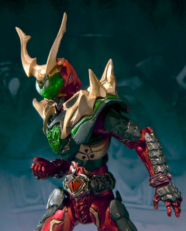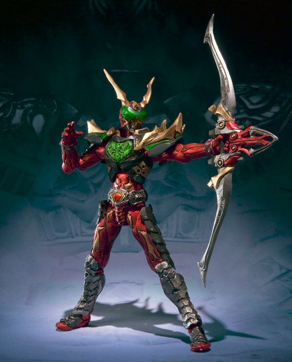 S.I.C.「仮面ライダーワイルドカリス」の鋭利な造形と、クリアー素材を生かした彩色の魅力を120ミリのサイズに凝縮。