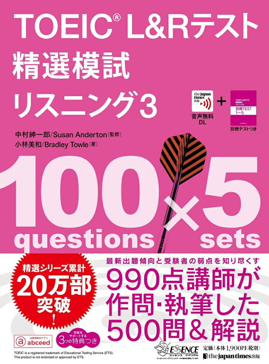 シリーズ35万部超。高評価×高実績の「精選模試」シリーズ第3弾!990点講師陣が選び抜いた最新の500問で、どんな問題にも太刀打ちできる真の実力を養う。★ 本番で予想されるあらゆるタイプの問題を5回の模試に完全網羅。★ 精鋭講師陣が新形式と最新の出題傾向を徹底解説。★ すべての設問について、正解を導くための手順と考え方をていねいに説明。★ スコアアップに直結する解答戦略と学習ポイントをアドバイスしたコラムも充実。★ すべての設問に「正答率」を掲載。本番でのスコアも予測できる。★ 学習をサポートする無料ダウンロード特典つき。★TOEIC自動採点・分析アプリ「abceed analytics」対応。【本書には、より効果的な学習をサポートする以下の無料特典教材がついています。】書影の真下の青いボタン「ダウンロード」をクリックしてください。音声はZipファイルを展開(解凍)してご利用ください。音声ファイルは、ジャパンタイムズ出版のスマートフォン用音声アプリ「OTO Navi」からも利用できます。1頻出語彙リスト(MP3音声つき)2質問または発言と正解応答のMP3音声(Part 2)3問題(TEST1〜5)のMP3音声