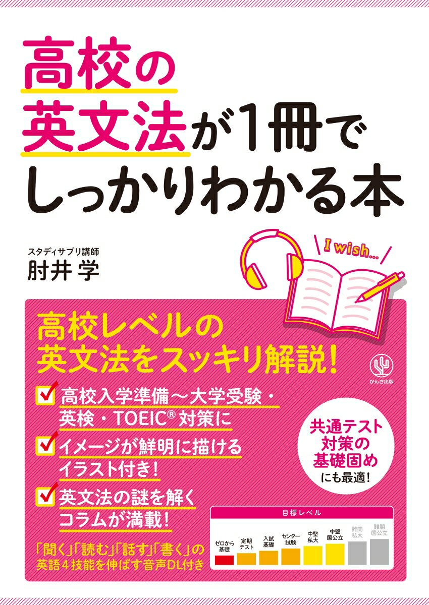 高校の英文法は難しい…文法って本当に苦手。そんな人に最適! この1冊で高校の英文法が基礎からしっかりわかる!■スッキリと読みやすい解説+イメージが鮮明に描けるイラスト→本書の最大の狙いは、英文法を単なる無味乾燥なルールの羅列から、生きたルールに変えることです。見えないつながりを見えるものにして、それぞれのルールの背景と理由、具体例を大切にしました。これにより、点の知識だったものが線でつながり、英文法の醍醐味を味わうことができます。例文にちりばめられたイラストで、その場面が鮮明にイメージできるようになっています。■4技能のトレーニングができる→英文法は英語の「読む・聞く・話す・書く」の4技能の根底を支える大切なルールです。本書では、英文法の力を4技能にあてはめるためのトレーニングを掲載しています。本書で学んだ英文法の知識を最大限活用して、英語の4技能の力を高めてください。■応用力やさまざまな知識が身に付く→各レッスンの「+α」のコーナーやコラムでは、応用文法や英文法の豆知識を掲載しています。「mustは“超おすすめ”の意味で使える」や「過去形や進行形を使うとなぜ丁寧になるのか」など、英文法を極めたい方に適した内容も紹介しています。■英文法の謎に迫る!→英文法には「時と条件の副詞節では未来のことでも現在形を使う」や「命令・要求・提案のthat節には動詞の原形を使う」など、有名なルールがいくつも存在しますが、そのルールがなぜ存在するのか、ルールの背景には何が存在したのかを解き明かしていきます。■年齢を問わず使える「一生モノの英文法」→本書は高校で学習する英文法を解説した本ですが、高校入学前の中学生の先取りとして、または大学生や社会人の方の学び直しとしても最適な1冊です。入試、資格試験、定期テストなどでも役立つ内容ですから、まさに一生モノの英文法を学ぶことができます。PART1 時制現在形/過去形 などPART2 助動詞基本助動詞/助動詞の代用表現 などPART3 仮定法仮定法過去・仮定法過去完了 などPART4 文型文の要素/第1文型 などPART5 受動態受動態の作り方/第4・第5文型の受動態 などPART6 不定詞名詞的用法/形容詞的用法 などPART7 動名詞動名詞の役割/動名詞と不定詞の違い などPART8 分詞名詞を修飾する分詞/補語で使用する分詞 などPART9 準動詞準動詞の主語/準動詞の否定語 などPART10 関係詞関係代名詞の基本/関係代名詞の省略 などPART11 比較原級の基本/原級の重要表現 など
