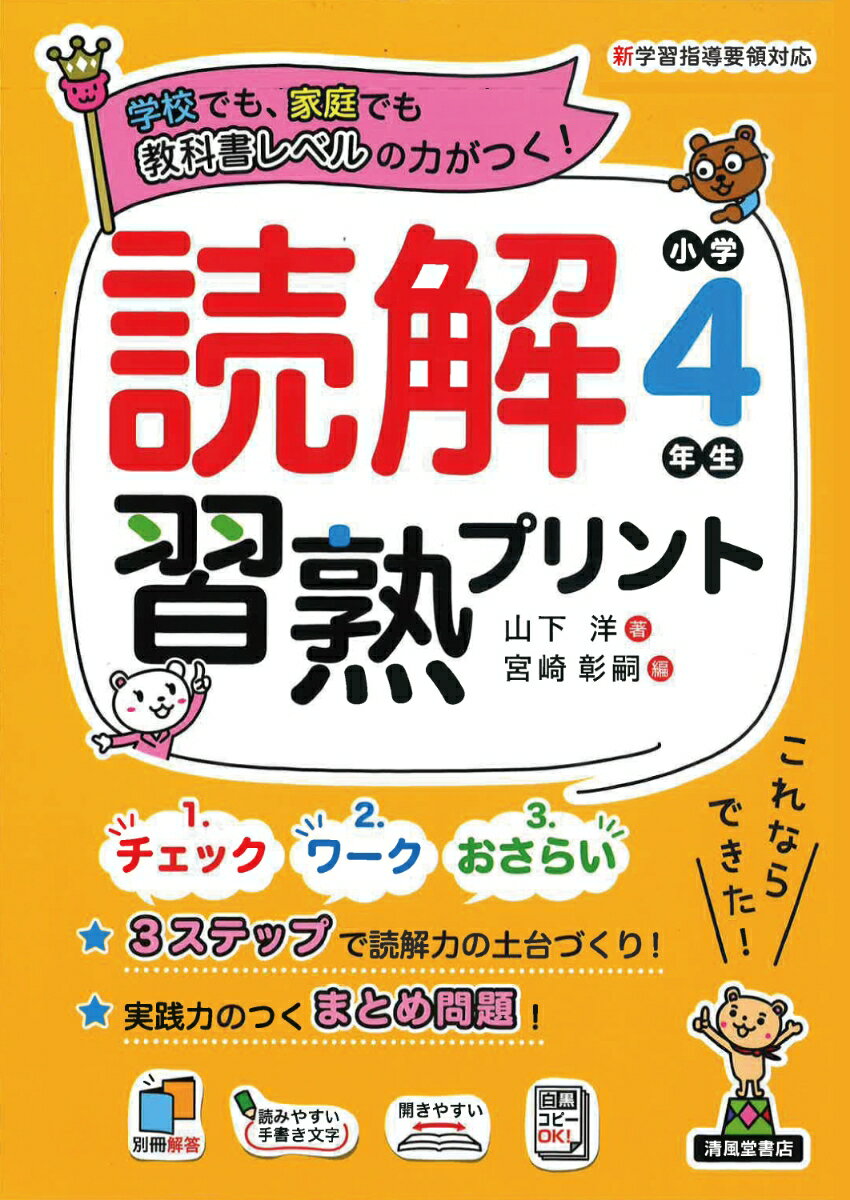 シリーズ累計100万部超のロングベストセラー商品!<br>従来からの特長である、<br>・通常よりも、さらに細かなスモールステップにする<br>・大事なところはくりかえして習熟できる<br>・教科書レベルの力が、どの子にも身につく<br>は、そのままにさらにパワーアップ!<br>以下の点が加わりました!<br>・読解力の土台をつくる、<br> チェック・ワーク・おさらいの「3ステップ学習」<br>・実践力のつく「まとめ問題」<br>・答え方で迷わない!答えに「ワンポイントアドバイス」<br>・理解度を助ける「太字の手書き風文字」<br>・白黒コピーで消えるページ番号(先生向け)<br>従来からさらにパワーアップした習熟プリントで、さらに子どもたちに力をつけましょう!<br>